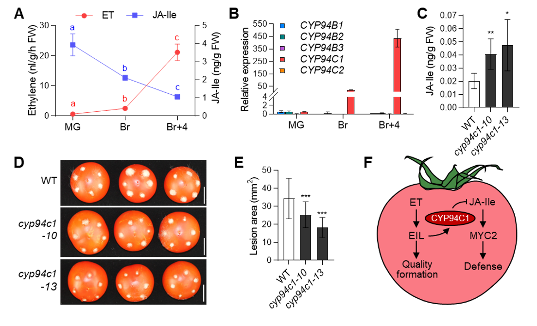 研究首先發現,在果實的成熟過程中,乙烯的生物合成量迅速上升,而活性茉莉酸JA-Ile的水平則急劇下降。與之相一致的是,乙烯調控的品質形成相關基因在果實成熟過程中上調表達,而茉莉酸調控的防御相關基因則在該過程中下調表達。此外,合成受茉莉酸正向調控的番茄堿,其水平也在果實成熟過程中急劇下降。綜上表明,茉莉酸水平的下降以其介導的抗性反應的下降本身就是果實成熟的內在組成部分。