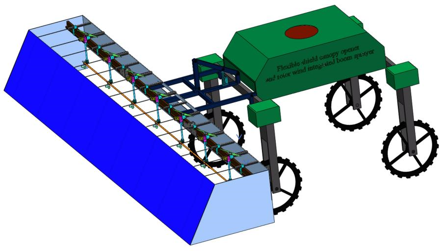 圖2 新型柔性罩蓋開(kāi)冠器與旋翼風(fēng)送一體化噴桿式噴霧機(jī)三維圖
