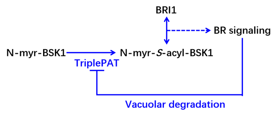 課題組進一步研究發(fā)現(xiàn),C亞族棕櫚酰基轉(zhuǎn)移酶功能缺失,減弱了BSK1的棕櫚酰化水平,抑制了BSK1與油菜素內(nèi)酯受體BRI1的互作。有趣的是,BR誘導(dǎo)C亞族棕櫚酰基轉(zhuǎn)移酶從質(zhì)膜向液泡的運輸及降解,暗示PAT-BSK1作為BR途徑中的一個負反饋模塊發(fā)揮功能(圖2)。