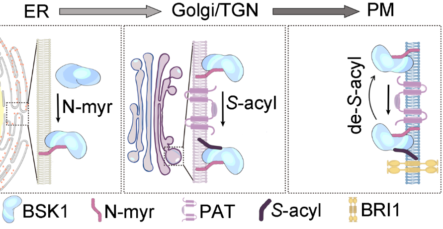 該研究中課題組通過T-DNA插入突變體結(jié)合CRISPR/Cas9基因組編輯技術(shù),創(chuàng)制了擬南芥C亞族棕櫚酰基轉(zhuǎn)移酶PAT19/20/22的高階突變體。其功能缺失表現(xiàn)為植株矮小,葉片窄,主根短,根分生區(qū)紊亂,氣孔密度增加,以及黑暗下生長的下胚軸短等表型,類似油菜素內(nèi)酯缺失突變體。課題組繼而證明了C亞族棕櫚酰基轉(zhuǎn)移酶特異性地與BR途徑關(guān)鍵胞質(zhì)類受體激酶BSK1互作,并催化BSK1的棕櫚酰化修飾。此外,BSK1作為一個受豆蔻酰化(N-myristoylation)和棕櫚酰化修飾的非跨膜蛋白,棕櫚酰化修飾確保了其從內(nèi)質(zhì)網(wǎng)-高爾基體靶向質(zhì)膜的過程(圖1)。這一機理可能普遍適用于植物細胞內(nèi)雙酯酰化修飾的非跨膜蛋白。