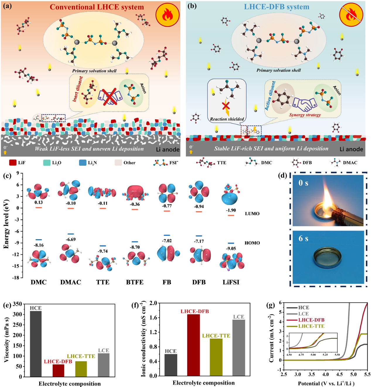 由高比容量鋰金屬負極和高壓富鎳正極組成的鋰金屬電池具有超高的理論能量密度(~500 Wh kg?1),是下一代二次電池的理想選擇。針對傳統易燃碳酸酯電解液電化學穩定窗口窄,與金屬鋰負極匹配存在的相容性差、SEI膜不穩定、枝晶生長等問題,本研究采用具有高LiF生成活性的1,2-二氟苯(DFB)作為活性稀釋劑來調控以N,N-二甲基乙酰胺(DMAC)為阻燃性溶劑的局部高濃度電解液(LHCE-DFB)。DFB能夠與雙氟磺酰亞胺(FSI-)陰離子協同構建堅固的富含LiF固體電解質界面膜(SEI)和正極電解質界面膜(CEI),增強了鋰金屬負極和NCM811正極的界面穩定性。相比于常規局部高濃度電解液易燃的醚類和碳酸酯溶劑,DMAC具有廉價、阻燃性能良好的優點,DMAC有效提高了LHCE-DFB的阻燃性能,LHCE-DFB的自熄滅時間為0 s g?1。DFB的強稀釋作用使LHCE-DFB粘度顯著降低(59.4 mPa s),離子電導率顯著提高(1.69 mS cm?1),同時浸潤性也得到顯著提高。LHCE-DFB具有高電化學穩定窗口(4.96 V)。該研究工作為安全高能電池電解液的設計提供了一種有前景且廣泛適用的活性稀釋劑-陰離子協同策略。