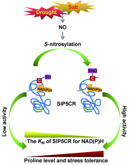 近日,園藝科學(xué)與工程學(xué)院鞏彪教授在《Plant Physiology》發(fā)表了“Genetic engineering of drought- and salt-tolerant tomato via Δ1-pyrroline-5-carboxylate reductaseS-nitrosylation”的研究論文。揭示了一氧化氮(NO)通過S-亞硝基化修飾脯氨酸合成關(guān)鍵酶Δ1-pyrroline-5-carboxylate reductase(P5CR),增強(qiáng)番茄脯氨酸合成和鹽堿、干旱抗性的分子機(jī)制。并提出SlP5CRCys5遺傳位點在番茄耐鹽抗旱和節(jié)水農(nóng)業(yè)中的潛在應(yīng)用價值,為番茄抗逆生物育種提供新的遺傳改良靶點。