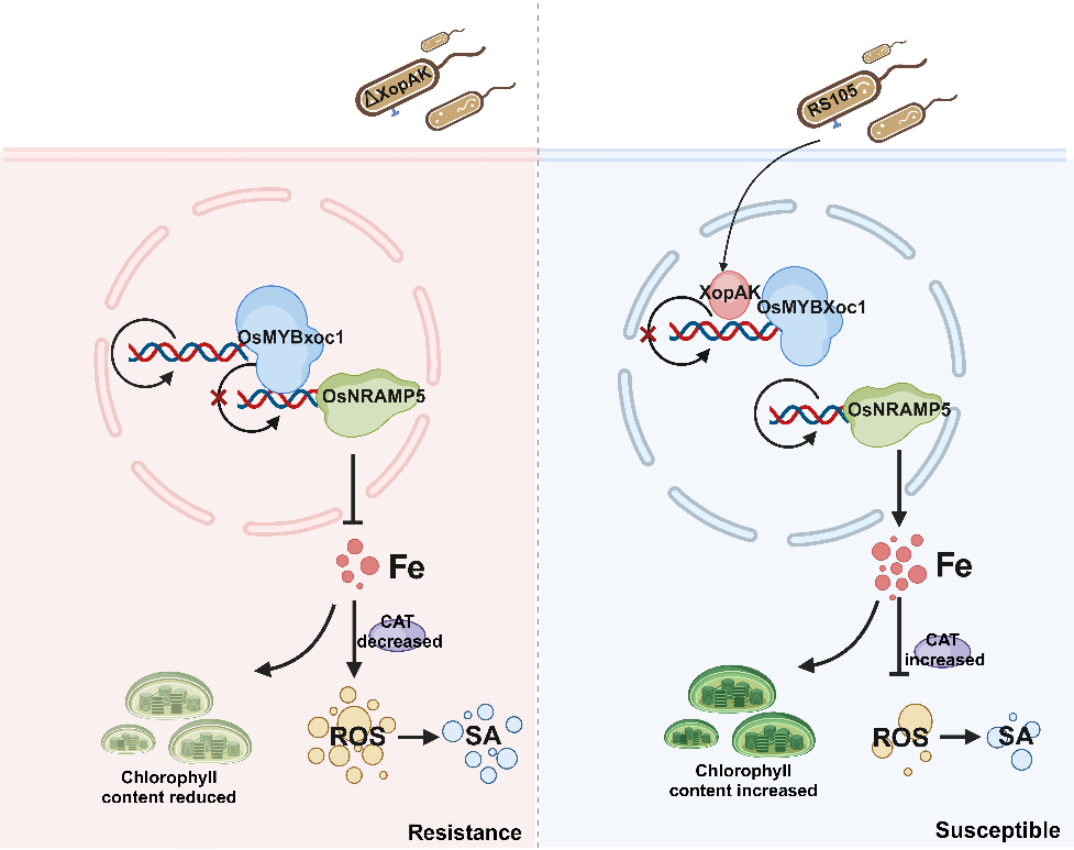 該研究鑒定到OsMYBxoc1是水稻中MYB轉錄因子家族的一員。超量表達OsMYBxoc1顯著提高水稻對條斑病的抗性,并伴隨著防御基因上調表達、SA信號路徑激活、ROS爆發等抗性反應。OsMYBxoc1特異性結合OsNRAMP5啟動子并抑制其轉錄。OsNRAMP5負調控水稻對Xoc的抗性,參與水稻對鐵離子、錳離子等的吸收(Sasaki et al., 2012)。OsMYBxoc1對OsNRAMP5的轉錄抑制作用影響了水稻體內鐵離子的含量及鐵離子依賴的過氧化氫清除酶活力,是改變水稻對Xoc抗性的因素之一。研究進一步證實外源鐵離子處理可以促進Xoc的感染并抑制水稻體內的SA信號,毒性蛋白XopAK可以直接抑制OsMYBxoc1的轉錄,暗示病原菌可能通過解除宿主對鐵離子轉運的限制來促進自身的增殖。此外,外源鐵離子可以恢復XopAK缺失突變體致病性缺陷的表型,進一步證實Xoc對鐵離子的利用可能是XopAK依賴的。總之,我們的研究揭示了OsMYBxoc1通過靶向OsNRAMP5調控水稻鐵離子的積累影響水稻抗性的新機制。