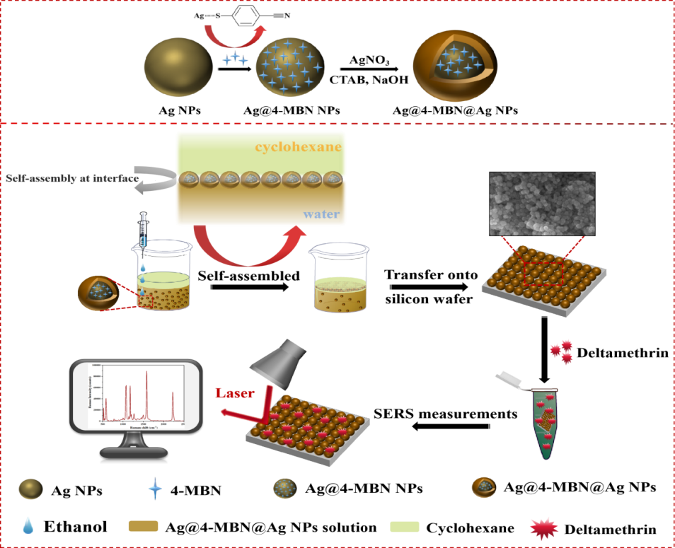 基于此,研究團隊建立了一種高精度、無干擾的表面增強拉曼光譜(SERS)比率型傳感器,用于食品中溴氰菊酯的檢測。位于“拉曼靜默區”的4-巰基苯甲腈(4-MBN)作為內標分子,提供了一個無干擾的腈伸縮振動(2226 cm-1),修正了由于檢測條件變化和納米陣列不均勻引起的拉曼信號波動,顯著提高了SERS傳感的抗干擾性。此外,構建的核殼結構的Ag@4-MBN@Ag納米陣列SERS比率型傳感器,對溴氰菊酯的檢測具有較寬的線性范圍、低的檢出限和良好的實際應用性。這項工作表明,以4-MBN作為內標分子研發的SERS比率傳感器在復雜體系中目標分析物的快速檢測領域具有廣闊的應用前景。