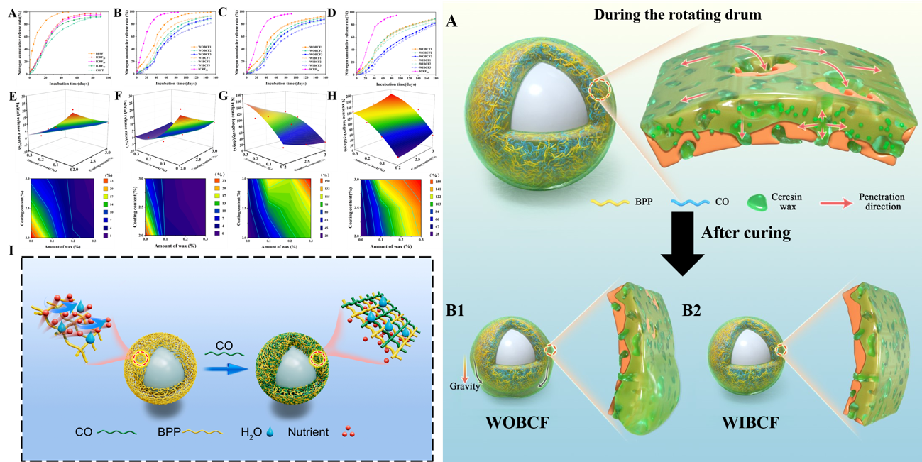 以生物基聚酯多元醇(BPP)為基礎(chǔ)制備聚氨酯膜材,低粘度蓖麻油(CO)為改性劑,降低BPP的粘度,制備了互改性涂層控釋肥料(ICRFs),以防止噴槍堵塞。在此基礎(chǔ)上,通過微晶蠟(CW)改性制備了疏水和致密蠟基包膜肥料(WBCF),以解決包膜過程中肥料顆粒之間的粘附和撕裂難題,WBCF表現(xiàn)出顯著的控釋特性,只需要3%的涂層材料,氮(N)釋放壽命接近180天。通過蠟內(nèi)外層添加和去除對(duì)照,揭示了蠟?zāi)軌蛟谀ぶ袧B透固化以調(diào)控微孔的養(yǎng)分控釋機(jī)制。