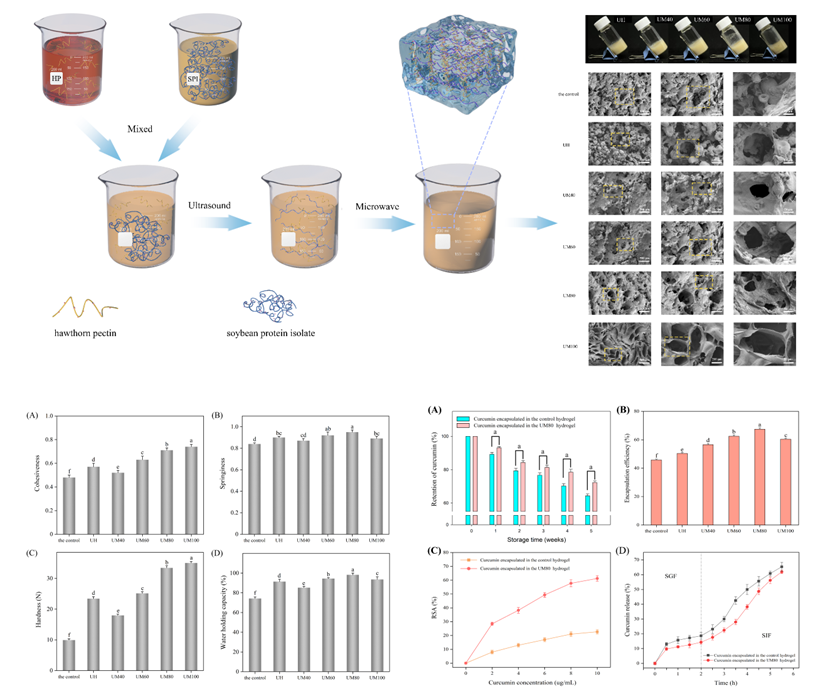 凝膠化已被證實是保護生物活性化合物免受胃腸道中發生的化學和酶降解的有效方法。山楂果膠和蛋白質合成的二元水凝膠具有良好質構特性和高負載效率,是構建生物活性化合物遞送系統的潛力原材料。然而,山楂果膠的長鏈結構在與蛋白質交聯的過程中可能會在一定程度上限制蛋白質的分散和聚集。因此,需要開發一種新型處理方法改善山楂果膠和大豆分離蛋白之間的分子交聯。本研究聯合超聲的空化作用和微波的快速加熱,使體系中的大分子鏈均勻分散,然后在縮合中快速通過凝膠裂解區,從而使制備的水凝膠結構更加緊湊和均勻。研究表明,適度的超聲-微波處理不僅可以顯著提高水凝膠的機械強度,還可以增加內部交聯的緊密性。水凝膠在儲存5周后最大限度地減少了包埋姜黃素的損失程度,提高姜黃素在胃腸道的生物利用度。綜上所述,這項工作的為超聲波微波技術改進水凝膠的能力以及蛋白-果膠水凝膠在食品工業中的應用奠定了理論基礎和實踐經驗。