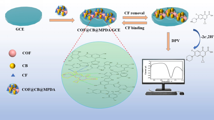 基于此,團隊以COF、CB為基體,多巴胺為功能單體,結合分子印跡技術研究合成了一種比表面積大、導電性能優異且具有特異性識別作用的COF@CB@MPDA納米材料用于環丙沙星的高靈敏電化學檢測。基于COF@CB@MPDA構建的傳感器對環丙沙星的檢測具有較寬的線性范圍、優異的選擇性和較高的準確性。這項工作表明,COF@CB@MPDA在食品危害物的電化學檢測中具有廣闊的應用前景。