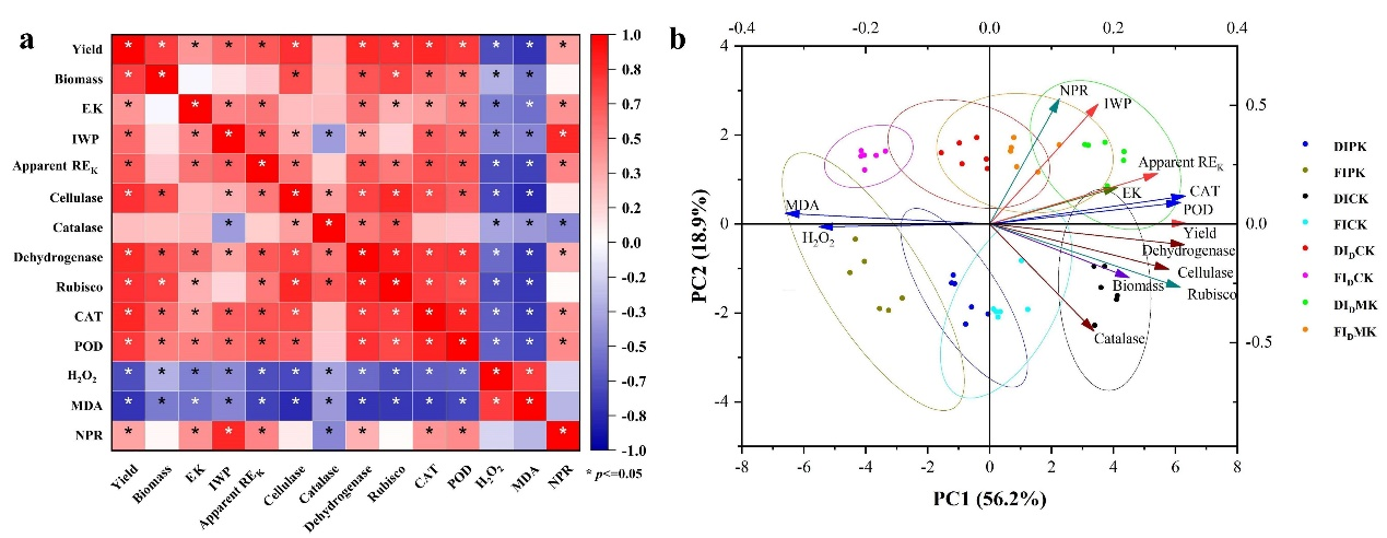 水分和養(yǎng)分是影響作物生長發(fā)育和產(chǎn)量形成的兩個(gè)重要環(huán)境因素,二者之間存在顯著的交互作用。滴灌和施用控釋肥作為我國重要的水分和養(yǎng)分管理方式,可以實(shí)現(xiàn)“以水促肥”和“以肥調(diào)水”,充分發(fā)揮水肥耦合效應(yīng)。基于此,本研究將滴灌與控釋鉀肥進(jìn)行耦合,探究其對玉米生長的影響。研究結(jié)果表明,滴灌較漫灌處理土壤含水量提高6.5~9.4%,水分利用效率提高3.8~13.0%。滴灌配施控釋氯化鉀處理較其他處理顯著提高玉米產(chǎn)量8.0~35.1%,水分利用效率7.2~37.3%,鉀肥利用效率8.7~22.1%。同時(shí),葉片凈光合速率、rubisco、過氧化氫酶、過氧化物酶和土壤酶活性也保持在較高水平。本研究為華北平原玉米可持續(xù)生產(chǎn)提供了理論和技術(shù)支持,對于保障我國糧食安全具有重要意義。