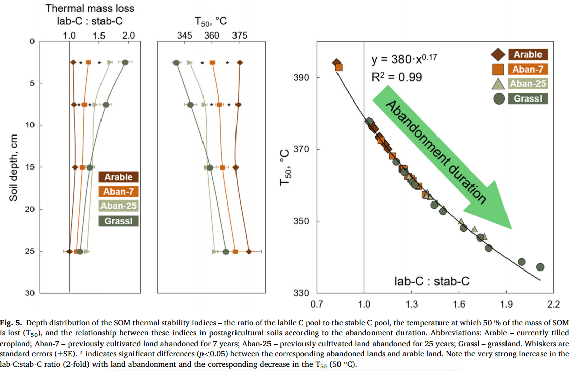 在世界范圍內(nèi),大面積的撂荒農(nóng)田正在進(jìn)行自然生態(tài)系統(tǒng)的恢復(fù)。撂荒農(nóng)田的生態(tài)系統(tǒng)變化是由植被演替驅(qū)動(dòng)的,并導(dǎo)致土壤及其功能的恢復(fù)。通過(guò)農(nóng)業(yè)活動(dòng)修復(fù)后農(nóng)田增加了土壤有機(jī)碳和能量?jī)?chǔ)量。MAOM組分在碳封存中起關(guān)鍵作用,而fPOM是微生物群落的主要能量來(lái)源。在超過(guò)25年撂荒期的0-30 cm土層中,土壤每年積累0.85 Mg C ha-1,C儲(chǔ)存增加了1.5倍,活性SOM的能量?jī)?chǔ)存翻了一番。在25年的土壤恢復(fù)過(guò)程中,活性碳的積累速度是穩(wěn)定碳的2.8倍。土壤熱穩(wěn)定性下降是由于穩(wěn)定碳積累速度加快和隨后微生物對(duì)穩(wěn)定碳分解的刺激共同作用,使得撂荒農(nóng)田土壤中碳循環(huán)加快。我們關(guān)于廢棄土壤中SOM熱穩(wěn)定性下降的研究結(jié)果對(duì)于理解廢棄土壤重新轉(zhuǎn)化為農(nóng)田時(shí)有機(jī)碳的潛在損失至關(guān)重要。