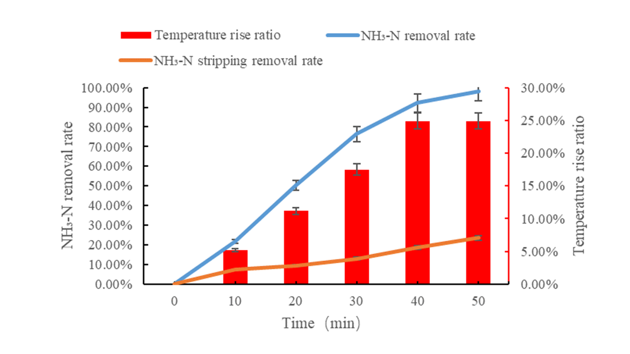 通過水楊酸捕獲生成的?OH,結果表明,適當提高電壓和放電頻率可以促進?OH的生成,從而有利于氧化反應去除NH3-N。通過自由基猝滅實驗驗證了等離子體的作用,在pH為12、電壓為12 kV、脈沖頻率為160 Hz的條件下,獲得了最佳的反應效率。處理50 min后,NH3-N去除率達99.14%;在氨氮污染日益嚴重的背景下,本研究在污水處理和環境保護方面具有重要意義。
