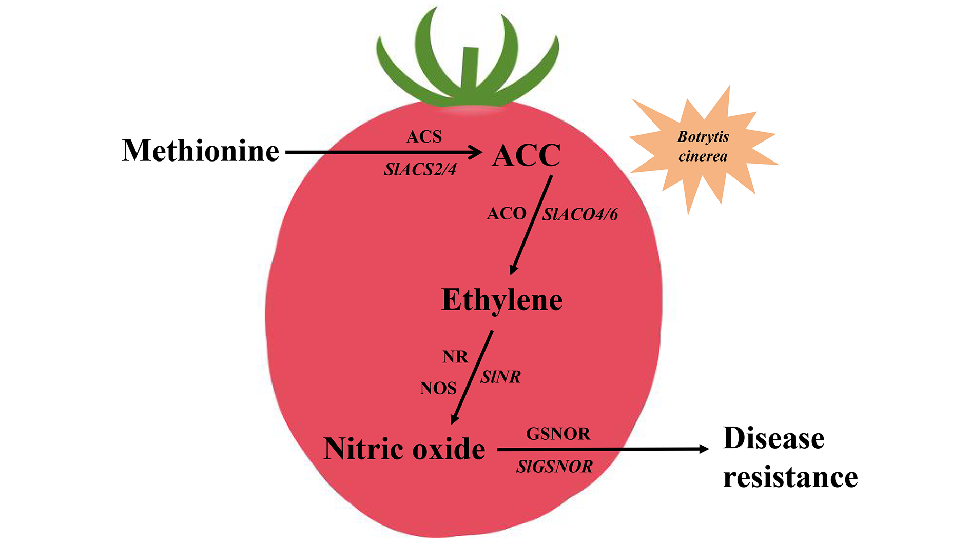 課題組前期的研究發(fā)現(xiàn),適宜的NO水平有利于增強(qiáng)番茄果實(shí)抗病性,GABA可通過調(diào)節(jié)GSNOR幫助番茄果實(shí)維持NO平衡(Wang et al., 2022)。在本研究中,研究者發(fā)現(xiàn)5 mM Met對(duì)灰霉菌菌絲生長(zhǎng)和孢子萌發(fā)并不具有直接抑制作用,但卻顯著降低了番茄果實(shí)灰霉病的病變直徑和發(fā)病率。相反,AVG和cPTIO處理增加了番茄果實(shí)對(duì)灰霉病的易感性。Met處理誘導(dǎo)了CHI和GNS活性,上調(diào)了SlCHI、SlGNS、SlPR1和SlNPR1的表達(dá)水平。同時(shí),Met預(yù)處理正調(diào)控與乙烯合成相關(guān)的基因(SlACS2/4、SlACO4/6和SlERF1/B4/C3)、與NO合成相關(guān)的基因(SlNR)及與NO代謝相關(guān)的基因(SlGSNOR)。同時(shí),與對(duì)照組相比,Met降低了ACS4和ACO6的亞硝基化水平。該研究闡明了甲硫氨酸通過提高番茄果實(shí)中與ACS和ACO相關(guān)的酶的活性和基因表達(dá)水平,從而促進(jìn)番茄果實(shí)中乙烯積累和信號(hào)傳導(dǎo)。乙烯合成途徑關(guān)鍵蛋白的去亞硝基化作用促進(jìn)了NO的生物合成和代謝,使得NO在體內(nèi)保持相對(duì)穩(wěn)定的水平,最終增強(qiáng)了番茄果實(shí)對(duì)灰霉菌的抗性。