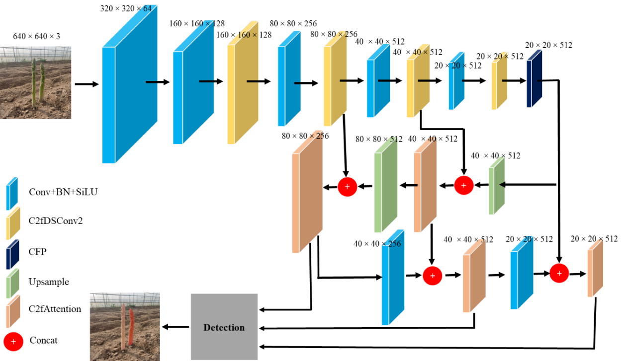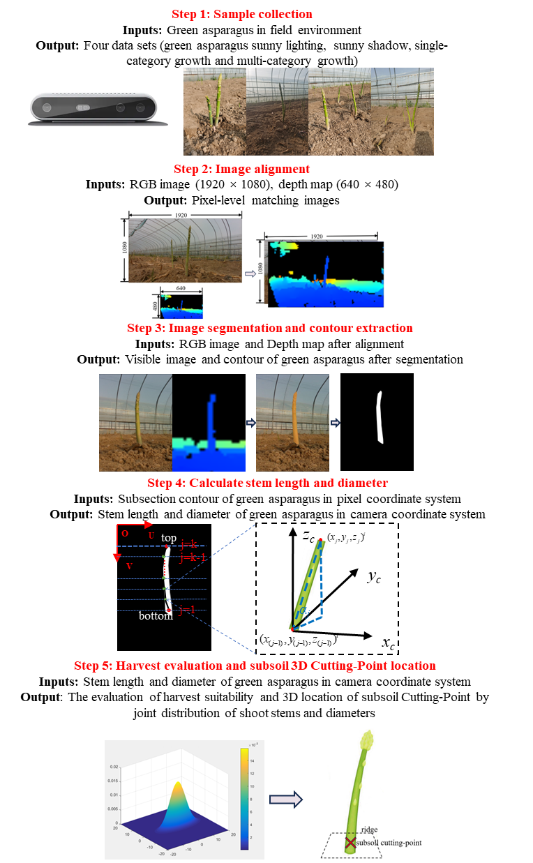 針對以上技術難題,山東農業大學苑進教授團隊以大田種植的綠蘆筍為研究對象,首創了S2CPL綠蘆筍選擇性采收過程中采收適宜性評價和土下切割點精確定位的關鍵方法。該方法利用RGB-D傳感器獲取綠蘆筍的圖像和空間深度信息,對YOLOv8的實例分割算法進行了研究和改進提高分割精度,同時提出了一種利用圖像掩模融合深度信息計算綠蘆筍長度和直徑的三維形態提取方法,最終實現了機器人選擇性采收的收獲評價和圖下三維切割點定位。該項研究還建立了一種為機械化采收末端執行器提供目標點信息的相機位姿優化方法。該技術有望為提高綠蘆筍選擇性采收中的視覺定位系統提供重要核心技術,實現成熟綠蘆筍自動化、智能化采收,促進綠蘆筍產業的發展。