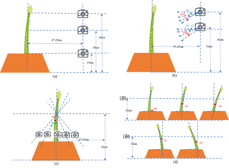 蘆筍是一種多年生宿根性草本植物,在20世紀80—90年代中國已成為世界上栽培面積最大的蘆筍生產國和產品出口國,面臨著收獲綠蘆筍的挑戰。蘆筍生長密集,同一根系生長出來的蘆筍嫩芽生長方向、生長成熟不一致,具有快速、零星生長的特點。目前全國幾乎所有蘆筍采摘等繁重的體力勞動仍由農民人工完成,綠蘆筍的采收需要根據其長度仔細選擇成熟的莖,另一方面,我國蘆筍一般生長在山脊上,需要用蘆筍刀在地表以下1至2cm的深度人工切割,因此這是一項勞動密集型和耗時的工作。實現田間綠蘆筍智能選擇性采收的關鍵在于采收適應度(長度、直徑等)的判別和綠蘆筍底土切點的精確定位。