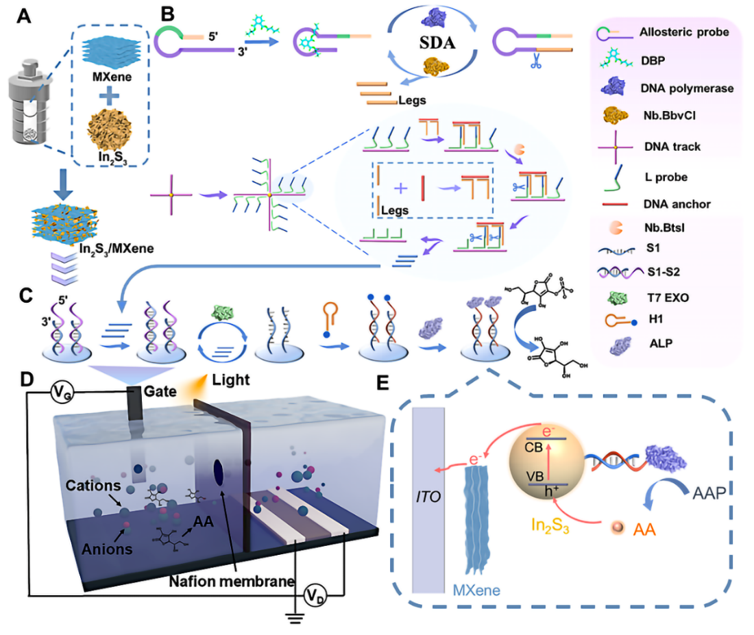 鄰苯二甲酸二丁酯(DBP)是主要的酞酸酯類塑化劑之一,因其相對廉價(jià)而被塑料生產(chǎn)商廣泛使用。DBP易于從塑料產(chǎn)品中滲出,進(jìn)入空氣、水和食品等環(huán)境中,已經(jīng)威脅到食品安全和人類健康。而現(xiàn)有的技術(shù)難以實(shí)現(xiàn)痕量精準(zhǔn)檢測水或食品塑料包裝中的DBP。有機(jī)光電化學(xué)晶體管(OPECT)傳感技術(shù)因其優(yōu)越的性能而成為一種先進(jìn)的分析技術(shù)。因此,在這項(xiàng)工作中,我們開發(fā)了一種新型的靶誘導(dǎo)雙足DNA Walker介導(dǎo)的In2S3/MXene肖特基結(jié)門控OPECT適配體傳感器。DNA Walker通過適配體和靶標(biāo)之間的識別被激活,然后沿著預(yù)定的軌道界面移動,實(shí)現(xiàn)了靶標(biāo)特異性識別和信號放大檢測的整合,從而獲得了更高的檢測靈敏度和更強(qiáng)的檢測特異性,提供了0.18 fM的低檢測限。該技術(shù)可為水環(huán)境及食品中痕量污染物檢測提供可行的表征手段,對食品安全和人類健康具有重要意義。