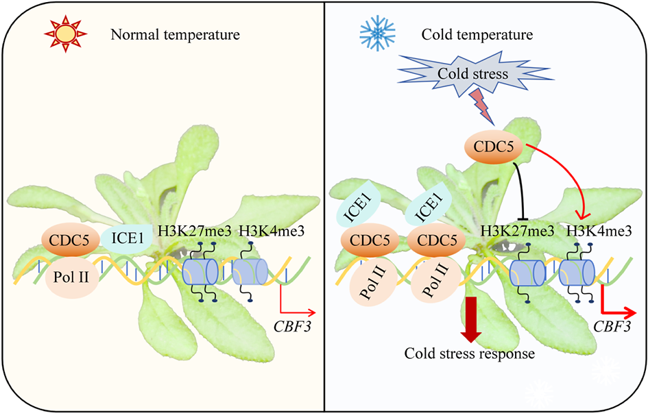 該研究發現,在冷脅迫下,CDC5會明顯被誘導。 CDC5的突變體對冷凍條件十分敏感,與野生型(Col-0)相比,冷凍處理后CDC5突變體的電解質外滲率更高。CDC5與ICE1相互作用并且結合到CBF3的啟動子上激活其表達。此外,冷脅迫條件下,CDC5可以招募更多的RNA聚合酶II (Pol II)到CBF3的啟動子上來調控CBF3的轉錄。此外,CDC5還可以通過促進CBF3染色質的H3K4me3水平以及抑制CBF3染色質的H3K27me3水平來促進CBF3的表達。