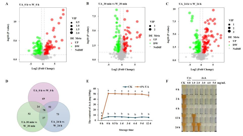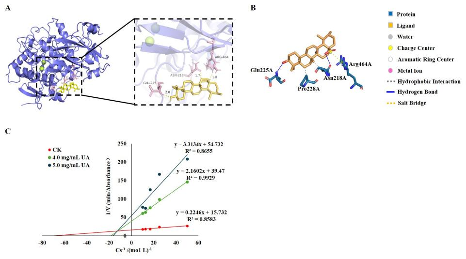 本研究首先將UA應(yīng)用于蘋果漿液與鮮切蘋果,發(fā)現(xiàn)UA能顯著抑制其褐變,因此對UA抑制褐變機(jī)制進(jìn)行了進(jìn)一步研究。研究主要探討了UA對蘋果多酚氧化酶(PPO)的作用機(jī)制,通過測定UA銅離子螯合能力、PPO酶促動力學(xué)及分子對接等初步判定UA對蘋果PPO的抑制類型為可逆的混合型抑制。通過測定過氧化物酶(POD)、超氧化物歧化酶(SOD)、過氧化氫酶(CAT)活性,DPPH、ABTS抑制率,H2O2和O2??含量可知,UA處理可通過提高鮮切蘋果抗氧化能力以及活性氧清除能力實現(xiàn)鮮切褐變抑制。由非靶向代謝組學(xué)結(jié)果分析可知,UA可通過調(diào)控抗壞血酸、烏頭酸等具有強(qiáng)抗氧化能力物質(zhì)的含量來抑制鮮切蘋果褐變。此外UA可抑制鮮切蘋果表面微生物的增長且在栗子、茄子、馬鈴薯和雪梨等果蔬褐變中具廣譜抑制效果。本研究為植物內(nèi)源性天然褐變抑制劑的開發(fā)開辟了新的方向,為UA在鮮切果蔬行業(yè)的應(yīng)用奠定了理論基礎(chǔ)。