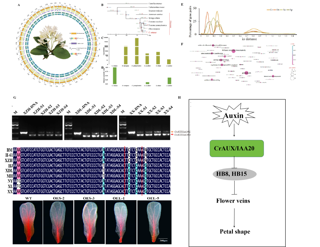 流蘇樹(Chionanthus retusus L.),屬于木犀科(Oleaceae)流蘇樹屬 (Chionanthus)落葉喬木,是華北地區(qū)重要的鄉(xiāng)土樹種,也是優(yōu)良的園林綠化觀賞樹種。研究選取了一種流蘇樹新品種——雪早花(Chionanthus retusus cv. Xuezaohua)為實(shí)驗(yàn)材料,應(yīng)用PacBio HiFi和ONT三代測(cè)序技術(shù),成功組裝了首個(gè)高質(zhì)量、無(wú)間隙流蘇樹參考基因組。組裝的兩個(gè)雪早花單倍型基因組大小分別為687 和 683 Mb,contig N50為31.57 Mb,BUSCO評(píng)分為99.3%,成功解鎖了流蘇樹基因組中端粒和著絲粒區(qū)域,對(duì)流蘇樹基因組學(xué)及分子育種研究具有重要的參考意義。通過表型和細(xì)胞學(xué)分析發(fā)現(xiàn),流蘇樹花瓣維管組織的差異是流蘇樹花形態(tài)變異的主要原因。在基于基因組的轉(zhuǎn)錄組分析中,生長(zhǎng)素相關(guān)基因負(fù)責(zé)花瓣形狀的形成。最后,我們確定了一個(gè)流蘇樹花形態(tài)發(fā)育的關(guān)鍵基因,CrAUX/IAA20,其表達(dá)量與花瓣維管組織表型呈現(xiàn)顯著的負(fù)相關(guān)。功能驗(yàn)證發(fā)現(xiàn),CrAUX/IAA20中第一個(gè)內(nèi)含子的去除和保留導(dǎo)致了兩個(gè)轉(zhuǎn)錄本的產(chǎn)生,CrAUX/IAA20表達(dá)水平的差異導(dǎo)致了花脈的變化。我們的發(fā)現(xiàn)將為流蘇樹的品種改良提供了新的見解和潛在的基因資源,加深我們對(duì)花形態(tài)發(fā)育的理解,并為木犀科植物的栽培提供重要的理論支持。