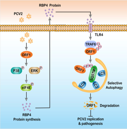 在本研究中,研究人員發(fā)現(xiàn)PCV2感染宿主細胞后能夠活化MAPK-eIF4E信號通路從而誘導(dǎo)RBP4蛋白水平顯著升高,RBP4升高后能夠顯著抑制PCV2的復(fù)制,而RBP4缺失后促進病毒復(fù)制。RBP4做為一種分泌型細胞因子,在胞內(nèi)合成后能夠分泌至胞外,以反饋的方式抑制PCV2的復(fù)制。深入研究表明,RBP4通過激活自噬受體SQSTM1/p62介導(dǎo)的PCV2病毒蛋白ORF1的選擇性自噬降解,進而抑制PCV2的復(fù)制。進一步研究發(fā)現(xiàn),RBP4通過活化TLR4信號通路活化下游的E3泛素連接酶TRAF6,從而觸發(fā)SQSTM1/p62介導(dǎo)的選擇性自噬,促進K63介導(dǎo)的病毒復(fù)制相關(guān)蛋白ORF1的泛素化降解。該研究結(jié)果證實RBP4是一個PCV2的關(guān)鍵宿主限制因子,揭示了宿主細胞防御PCV2感染的新機制。該項研究為深入理解PCV2的發(fā)病機制以及新型抗病毒藥物研發(fā)提供了重要理論依據(jù)。