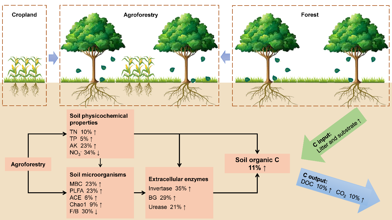 農(nóng)林復(fù)合作為一種動(dòng)態(tài)的、以生態(tài)為基礎(chǔ)的自然資源管理系統(tǒng),可以改變植物碳的輸入和微生物介導(dǎo)的碳輸出,進(jìn)而影響土壤有機(jī)碳的積累。然而,目前還缺乏對(duì)全球范圍內(nèi)農(nóng)林復(fù)合固碳潛力的定量分析。在此,通過收集全球561對(duì)觀測(cè)數(shù)據(jù)進(jìn)行薈萃分析,以量化農(nóng)林復(fù)合對(duì)土壤有機(jī)碳固存以及土壤特性和微生物的影響。與其他土地利用方式(耕地、森林和未開墾土地)相比,農(nóng)林復(fù)合平均增加了10.7%的土壤有機(jī)碳、10.2%的溶解性有機(jī)碳和10.2%的二氧化碳排放量。在所有氣候區(qū)中,干旱地區(qū)農(nóng)林復(fù)合的土壤有機(jī)碳增加最多(18.7%)。與單一種植模式相比,農(nóng)林復(fù)合在微生物生物量、多樣性和土壤養(yǎng)分含量方面更具優(yōu)勢(shì)。本研究結(jié)果表明農(nóng)林復(fù)合作為一種恢復(fù)、保護(hù)和減緩氣候變化的種植策略值得推廣,尤其是在干旱地區(qū)。