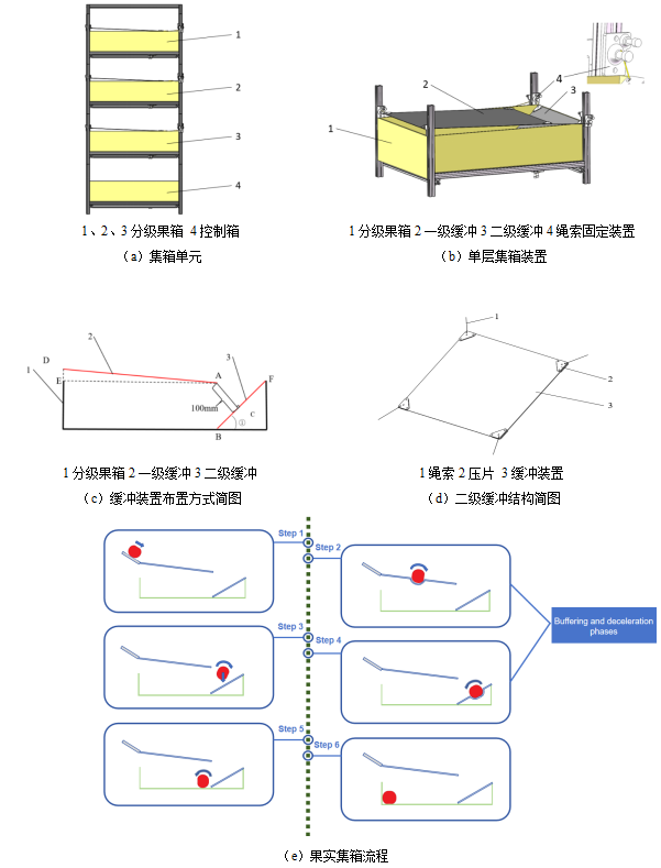 果蔬采收機(jī)器人技術(shù)能有效應(yīng)對勞動力稀缺挑戰(zhàn),發(fā)展前景極為廣闊。然而在果實(shí)分離后水果輸送裝箱過程中,易受機(jī)械損傷可能導(dǎo)致存質(zhì)量下降、顯著影響貨架壽命的問題不容忽視。目前,大多數(shù)果蔬采收機(jī)器人設(shè)計為緊湊型,以適應(yīng)果蔬種植環(huán)境,但在高效采收與采后果實(shí)損傷之間的協(xié)調(diào)性方面尚未達(dá)到理想狀態(tài),對于適應(yīng)緊湊結(jié)構(gòu)集箱方案研究仍存在諸多空白。因此,開發(fā)一種與采摘并行的無動力果實(shí)集箱方案,并結(jié)合適宜的損傷模型進(jìn)行損傷分析,以實(shí)現(xiàn)高收獲效率和低水果損傷,已成為一個亟待解決的問題。