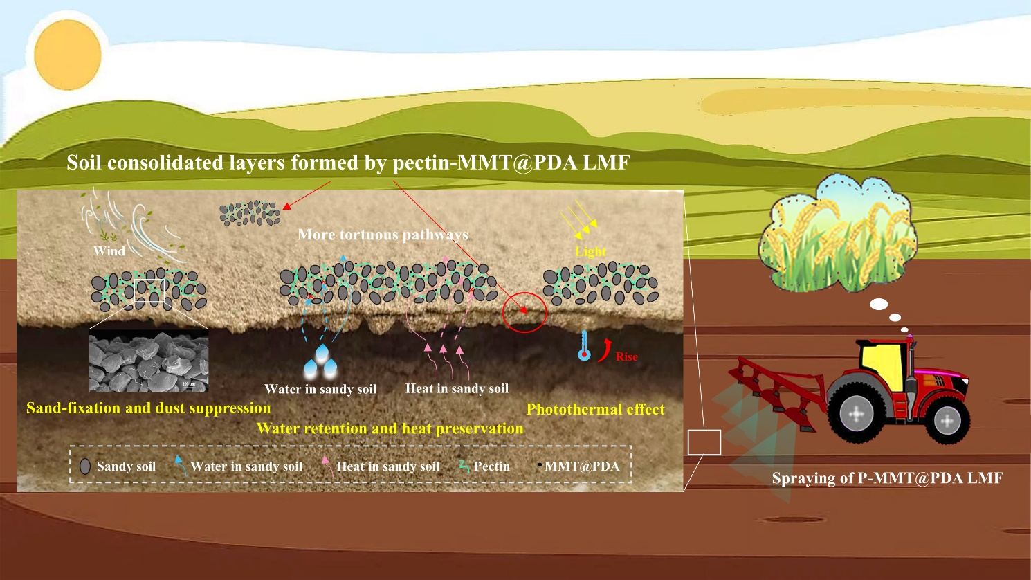 與傳統(tǒng)的不可生物降解塑料地膜相比,天然聚合物基液態(tài)地膜具有良好的生物降解特性,可以更好的鋪設(shè)在崎嶇地形以應(yīng)對風(fēng)沙侵蝕,因而受到了廣泛的關(guān)注。然而,單純使用天然聚合物材料制備的液態(tài)地膜結(jié)構(gòu)疏松,空隙較多,功能有限,這嚴(yán)重影響了其抗風(fēng)蝕、保水和保溫性能,極大的限制了其實(shí)際應(yīng)用范圍,尤其是在寒冷干旱的荒漠化地區(qū)。本文制備了聚多巴胺包覆蒙脫土微/納米顆粒增強(qiáng)的果膠基多功能可噴涂液態(tài)地膜。多巴胺具有豐富的活性位點(diǎn),其在蒙脫土表面的自聚合提高了蒙脫土與果膠鏈的相容性,促進(jìn)了蒙脫土在果膠聚合物中的分散性,并通過氫鍵作用使它們更緊密地纏結(jié)在一起。因此,本研究制備的液態(tài)地膜具有更好的機(jī)械性能(提高了64.94 N)和抗風(fēng)蝕性能(風(fēng)速 30 m/s,大于 60 min)。此外,聚多巴胺包覆的蒙脫土微粒/納米粒子可填充果膠鏈的空隙,從而提高果膠基液態(tài)地膜的致密性和網(wǎng)絡(luò)結(jié)構(gòu)的復(fù)雜性,使其具有更好的保水性(提高了 14.67 %)和保溫性(提高了 3.14 °C)。同時,聚多巴胺的光熱效應(yīng)還賦予了該地膜良好的升溫效果(升溫 2.84 °C)。得益于這些特性,本研究制備的液態(tài)地膜可有效促進(jìn)小麥生長,并具有良好的生物降解性。這些結(jié)果表明,在干旱和寒冷環(huán)境中應(yīng)用聚多巴胺包覆蒙脫土微/納米顆粒增強(qiáng)的果膠基多功能可噴涂液態(tài)地膜是一種有效的策略,有望為未來農(nóng)業(yè)可持續(xù)發(fā)展和環(huán)境保護(hù)提供綠色解決方案。