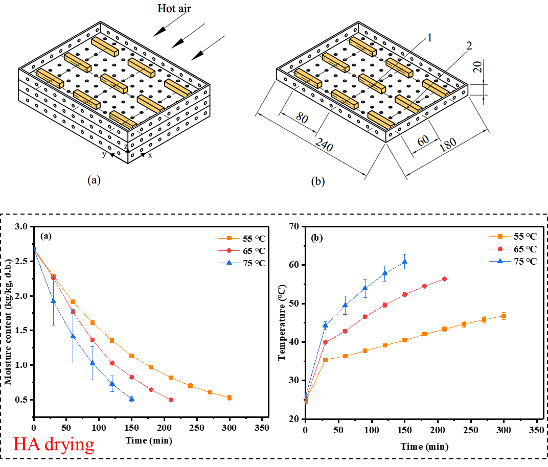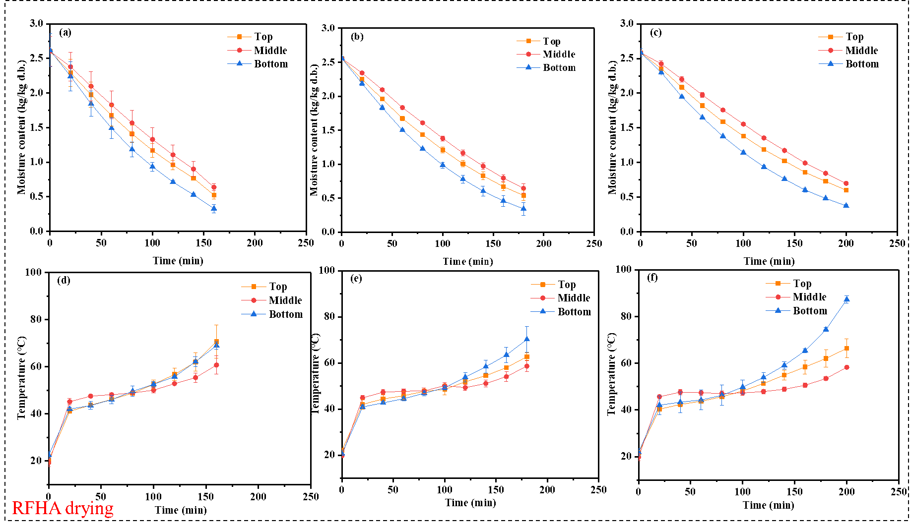質地柔軟、味道甜美的紅薯果脯深受消費者歡迎。熟化后的甘薯果脯對人體有更多益處。射頻結合烤箱(RF-O)烘烤被認為是一種高效的紅薯熟化方法,時間短,產品質量好。RF-O預處理后,RFHA的趨勢與RFHA-HA干燥對樣品的趨勢相似。與HA干燥(210 min)相比,RFHA干燥(180 min)和RFHA-HA干燥(200 min)在干燥時間上顯示出較小的優勢。三種干燥處理后的樣品具有相近顏色(?E值9.81–11.12)、質地(硬度值2360.67-3345.07 gf)和可溶性固形物含量(20.72%-21.81%)的優質紅薯果脯。因此,RF-O熟化可以作為紅薯干燥前的短時預處理,為食品工業的干燥過程提供指導。