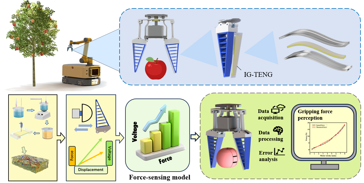 針對以上技術難題,研究團隊制備了一種基于摩擦納米發電機的柔性自驅動力感知傳感器(IG-TENG),并成功應用于新鮮果蔬的無損采摘。實驗結果表明,IG-TENG 具有卓越的可拉伸性、良好的電輸出性能以及長期工作穩定性。在0-20 N內表現出高靈敏度(3.53 V/N)、良好的線性度(R2= 0.989)以及對不同抓取位姿的良好適應性,力感知準確率高達 93.77%。此外,該傳感器憑借制造工藝簡單、可擴展,成本低、無污染和自供電等優勢,在柔性電子、智能機器人、農業采摘及可穿戴設備等領域展現出廣闊的應用前景。
