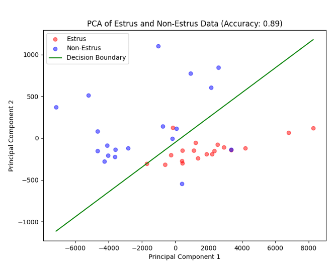 此外,研究團(tuán)隊還通過主成分分析(PCA)對奶牛行為數(shù)據(jù)進(jìn)行了降維處理,成功區(qū)分了發(fā)情和非發(fā)情行為。通過結(jié)合極坐標(biāo)變換和PCA,能夠更精確地識別奶牛在發(fā)情期間的細(xì)微行為變化,如突然的方向改變和短促的移動。