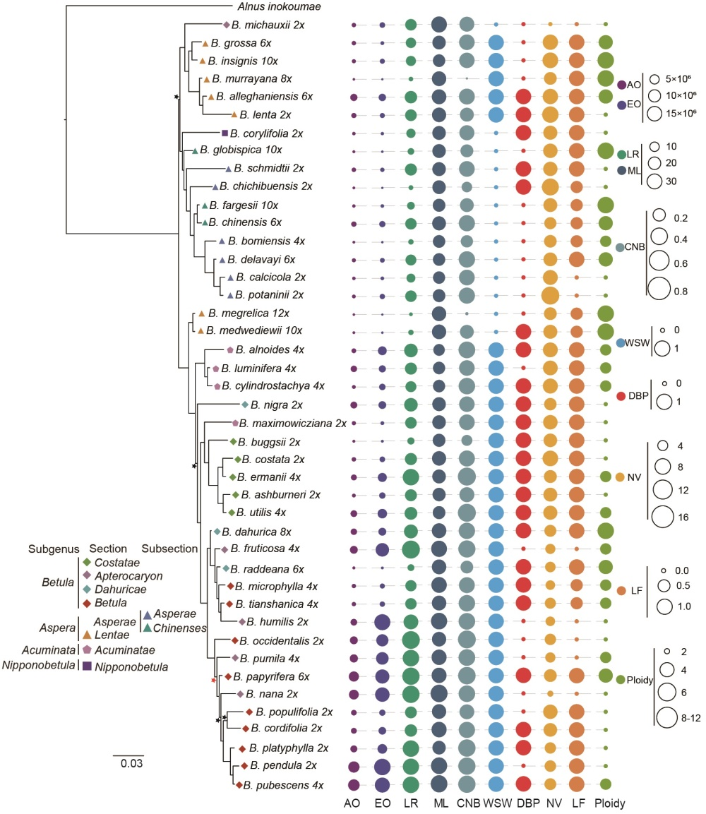 圖1 樺木屬物種系統(tǒng)發(fā)育關(guān)系、地理分布面積、性狀及倍性。