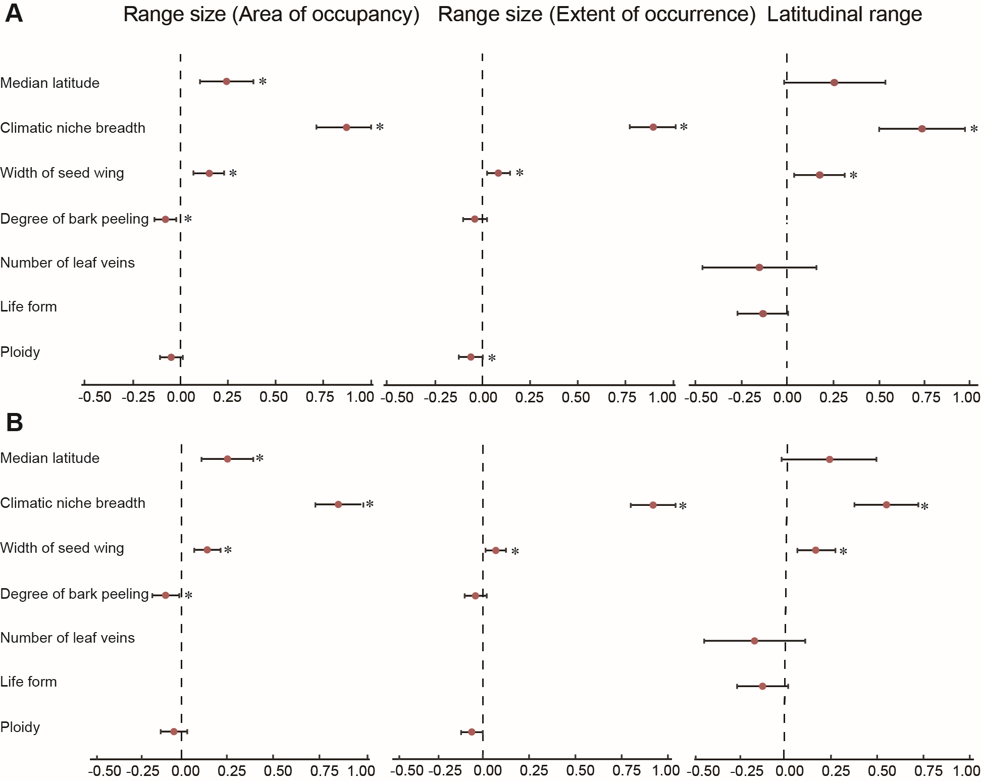 圖2 緯度、氣候生態(tài)位寬度、種子翅長、樹皮剝落、葉脈數(shù)量、生活型及倍性對地理分布范圍的影響。