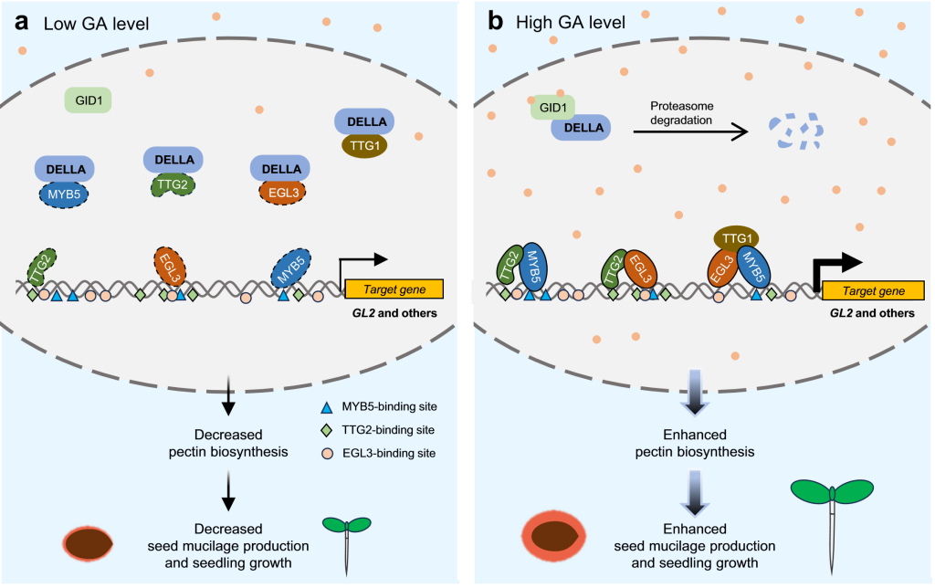 已有研究表明MYB-bHLH-WD40(MBW)復合體和TTG2促進果膠合成。在此基礎(chǔ)上,該研究首先明確了GA通過依賴DELLA蛋白的方式促進果膠的生物合成。進一步研究發(fā)現(xiàn)DELLA蛋白分別與MBW復合體和TTG2直接互作,并抑制MBW和TTG2的結(jié)合。此外,DELLA抑制MBW復合體以及TTG2的DNA結(jié)合活性,進而阻遏其對下游靶基因的轉(zhuǎn)錄激活作用。遺傳學分析進一步證實了GA通過DELLA-MBW-TTG2信號級聯(lián)模塊調(diào)控果膠合成,并在維持細胞粘附以及促進幼苗生長方面具有重要作用。