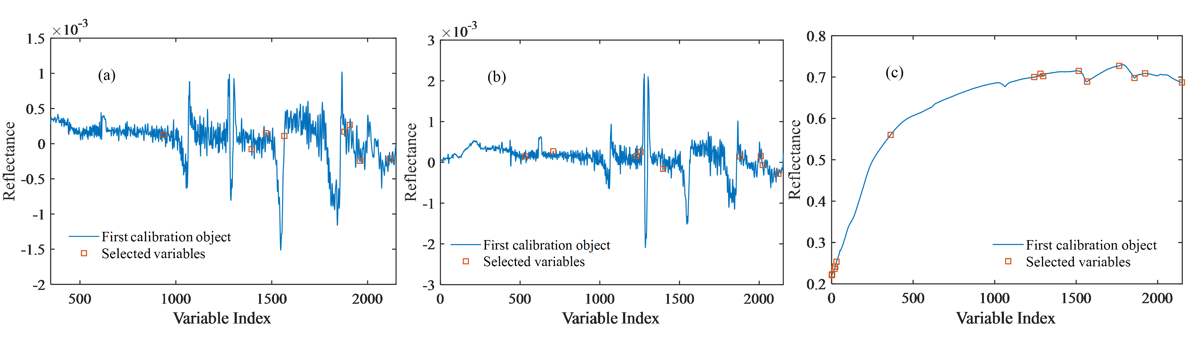 圖2 基于SPA的土壤中氮(a)、磷(b)、鉀(c)特征提取結果