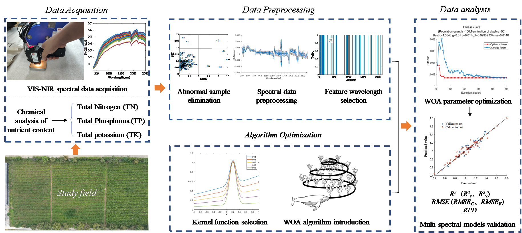 針對以上技術難題,研究團隊采用可見-近紅外光譜(Vis-NIR,350–2500 nm)檢測手段,開發(fā)一種基于機器學習算法的快速、低成本、高精度的土壤營養(yǎng)成分檢測方法,特別針對總氮(TN)、總磷(TP)和總鉀(TK)的精準測定,助力現代化精準農業(yè)的發(fā)展。具體的,本研究采用融合徑向基核函數(RBF)與多項式核函數(Poly)的RBF-Poly混合核函數,聯合支持向量機(SVM)定量預測算法,構建土壤中總氮、總磷、總鉀等養(yǎng)分的定量預測模型。引入鯨魚優(yōu)化算法(WOA)優(yōu)化模型中g(核函數參數)、c(懲罰因子)和γ(權重系數)參數,優(yōu)化模型預測結果。研究結果表明,對于TN、TP和TK的最優(yōu)模型驗證集預測結果分別為0.902、0.937和0.904,模型剩余預測偏差分別達到3.206、3.939和2.608,為準確、無損檢測土壤養(yǎng)分提供了穩(wěn)定可靠的預測模型。該研究成果在農業(yè)與環(huán)境管理實踐中具有重要應用價值,有助于實現更高效、更準確的土壤養(yǎng)分監(jiān)測與管理。