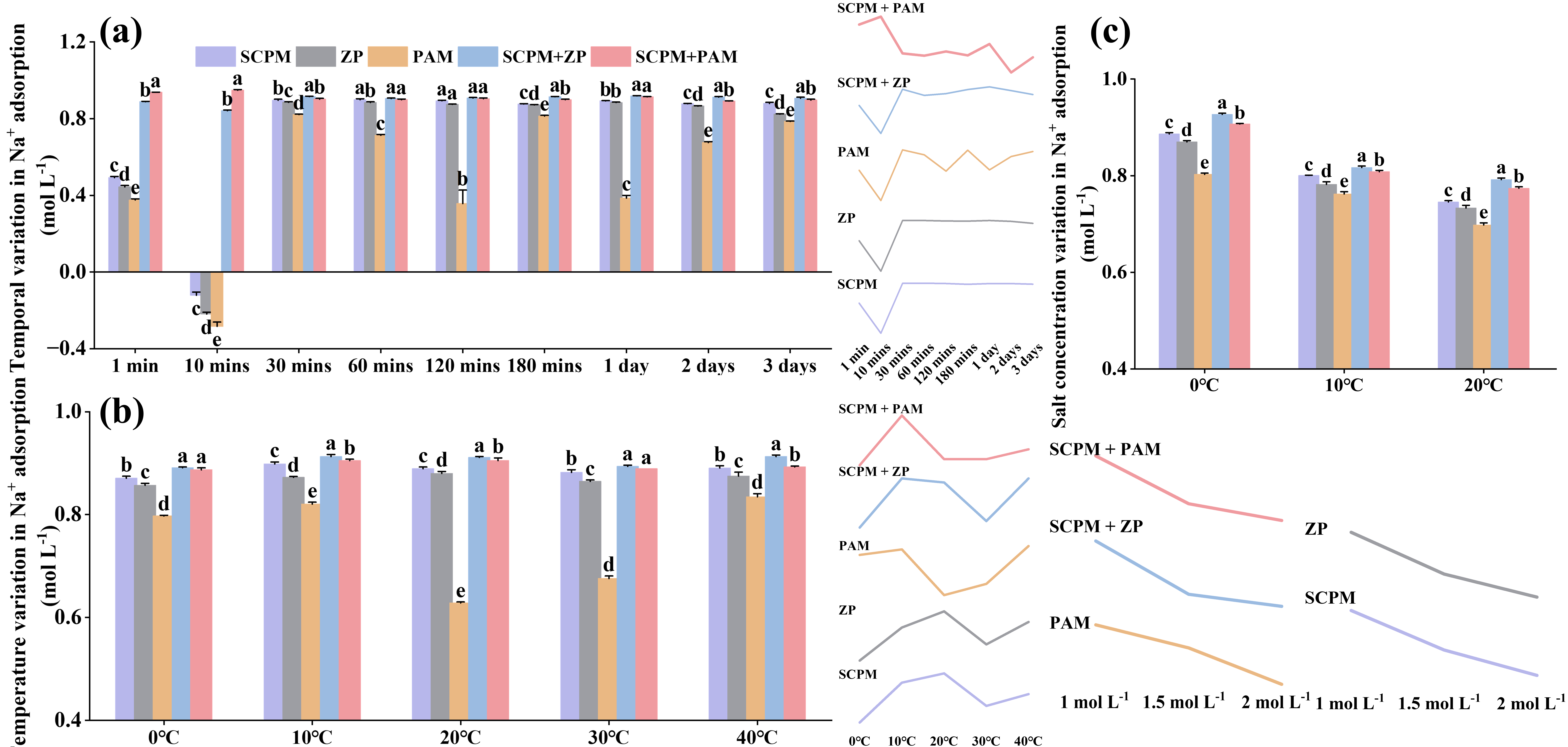 圖1 Na+的理想吸附量。(a): Na+吸附量隨時(shí)間的變化。(b): Na+吸附量隨溫度的變化。(c): Na+吸附量隨鹽濃度的變化。