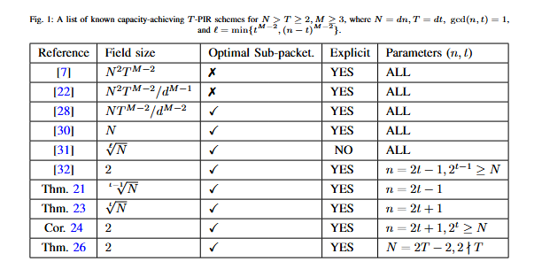 為了克服這一困難,本文創(chuàng)造性提出基于小域上MDS陣列碼來構造的最優(yōu)PIR方案。具體來說,首先利用M-1個具有特定類型信息集的MDS陣列碼,設計了小域上分包最優(yōu)且達到容量抗合謀保密信息提取方案的一般框架,從而最優(yōu)PIR方案的構造問題轉化為小域上具有特定信息集的MDS陣列碼的構造問題。其次,利用乘積碼與組合技巧將該問題轉化為構造一個具有特定信息集的MDS陣列碼。然后,應用加群陪集、Trace函數、冪和、線性化多項式的牛頓恒等式等理論基礎發(fā)展出廣義子式矩陣這一工具,進而刻畫其各階順序主子式。最終,我們基于廣義子式矩陣這一最新理論工具,成功構造出三大類小域上的最優(yōu)PIR方案,具有結果與比較如表1所示。