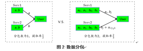 私有信息檢索(Private Information Retrieval, PIR),是信息安全領域的一個重要研究課題,主要關注的是如何在不泄露查詢內容的前提下,從多個數據庫中提取檢索信息,如1圖所示。PIR自從提出以來,已在軍事、商業(yè)等領域有著重要應用。容量是衡量PIR方案效率的重要指標,而數據分包是設計達到容量的PIR方案的重要技術,如圖2所示。然而現有的最優(yōu)方案需要在很大的域上構造,這嚴重制約了方案的實用性。