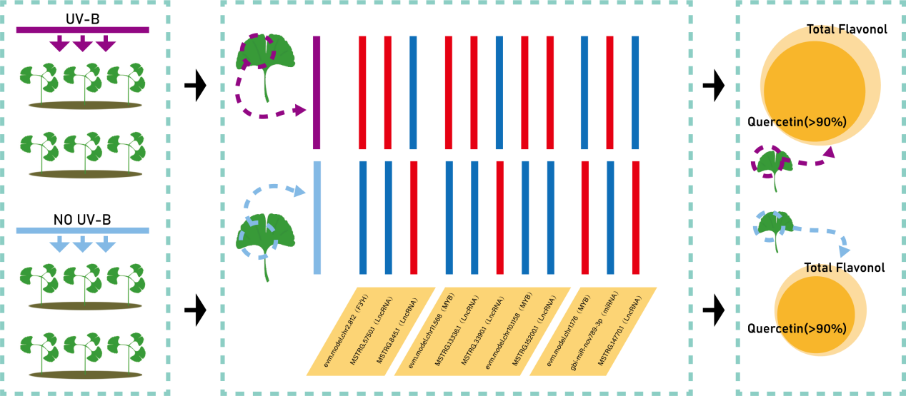隨著環境紫外線(UV)強度的增強,紫外脅迫成尤其是紫外線B(UV-B)脅迫成為了在植物生長過程中不可忽視的環境因素。目前已有相關研究表明,銀杏可以通過類黃酮的積累來應對UV-B脅迫,且調控銀杏類黃酮合成的結構基因與轉錄因子也被廣泛的發掘并研究。然而在UV-B輻射下LncRNA-miRNA-mRNA協同調控銀杏類黃酮合成的分子機制尚不明確。