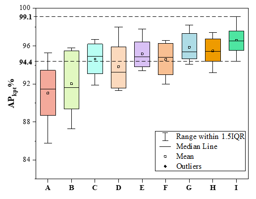 圖1 消融試驗結果箱線圖。模型A-I分別對應不同的改進方法。