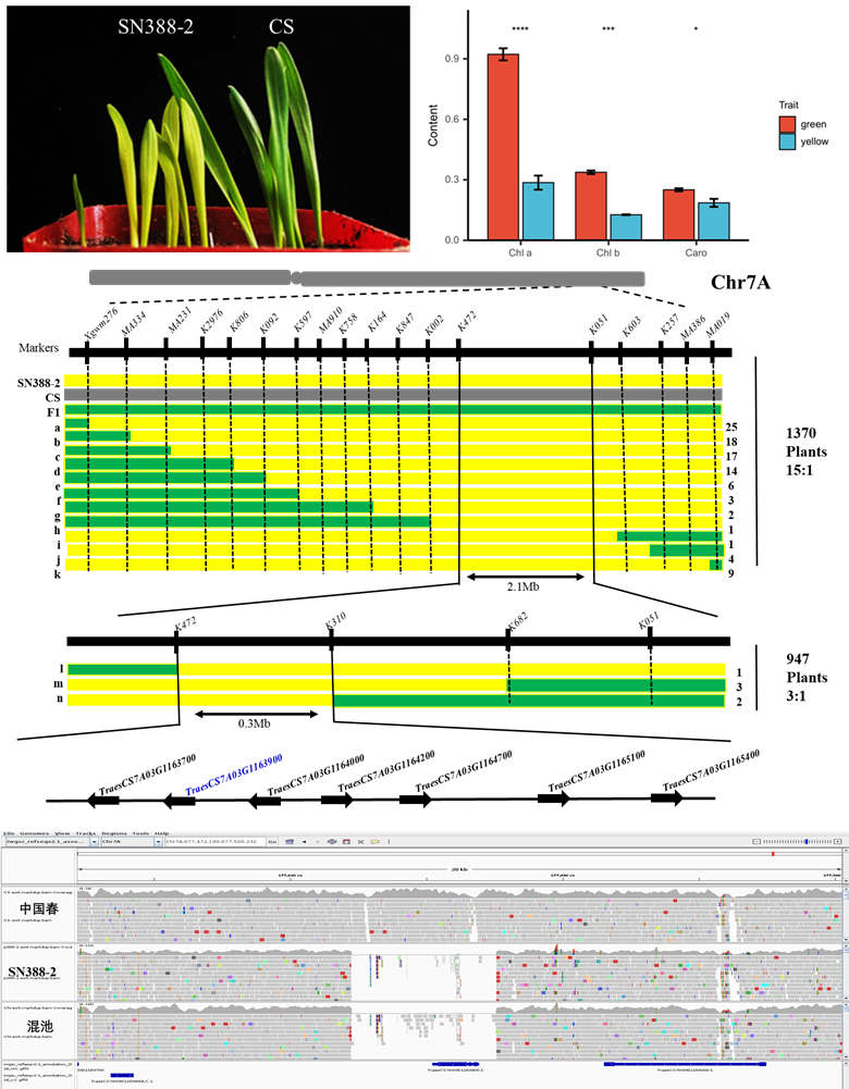 小麥黃葉突變體是研究作物葉綠素合成、葉綠體發育和光合作用機制的重要基礎材料。李興鋒教授團體長期從事遠緣雜交和小麥種質資源創新研究,在普通小麥和六倍體小黑麥復合雜交后代代中篩選到一份特殊的葉片黃化新種質SN388-2,遺傳分析和分子標記定位結果表明其黃化性狀受小麥7A和7D染色體上兩對隱性基因控制。基于圖位克隆和染色體結構變異檢測技術,發現小麥Y1-7A編碼的CHLI蛋白缺失導致SN388-2葉綠素合成受阻;CHLI蛋白屬于ATP活性的鎂螯合酶家族,亞細胞定位表明該CHLI蛋白在葉綠體上發揮作用;通過WGCNA分析挖掘了SN388-2葉綠素含量恢復相關6個關鍵的Hub基因。Y2-7D的候選基因有待后續研究驗證。