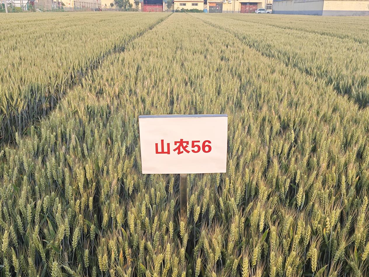 小麥新品種‘山農56’(國審麥20251056)由孔令讓教授團隊選育,系濟麥22-粗山羊草漸滲系與良星619雜交后選育,2022年通過山東省審定(魯審麥20220003)。該品種半冬性、幼苗半匍匐,分蘗力強;株高78.3厘米,株型較緊湊,抗倒性較好,綜合抗病性好,對小麥莖基腐病有一定抗性;平均畝穗數44.3萬穗,穗粒數35.9粒,千粒重44.1克。