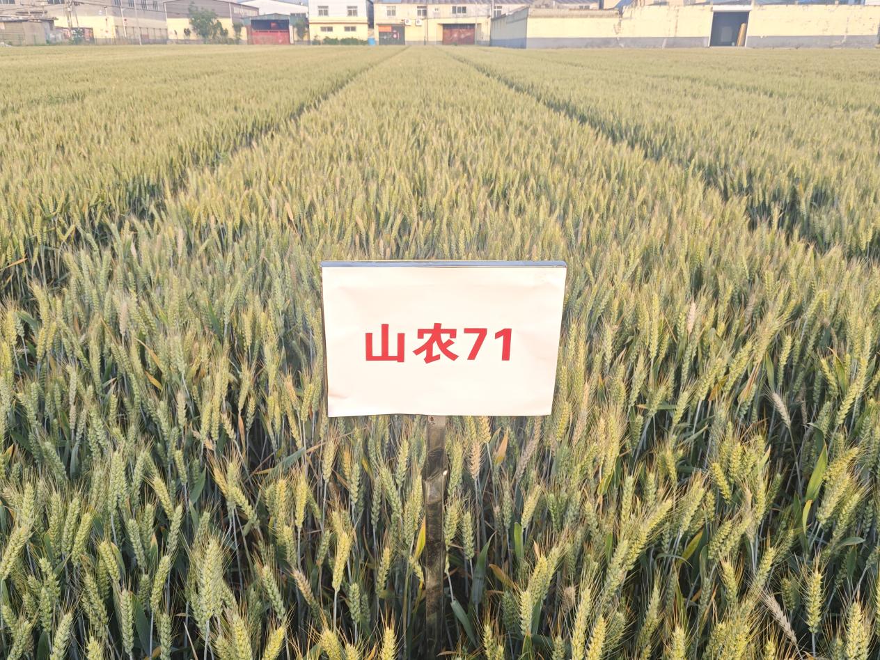小麥新品種‘山農71’(國審麥20253027)由孔令讓教授團隊選育,系山農27083與西農979雜交后代選育。半冬性,全生育期225.8天,比對照品種濟麥22熟期稍早,幼苗半匍匐,分蘗力強;株高75.7厘米,株型緊湊,抗倒性較好,抗寒性較好;穗長方形,籽粒硬質,飽滿度好;平均畝穗數40.7萬穗,穗粒數38.0粒,千粒重44.8克;綜合抗病性好。