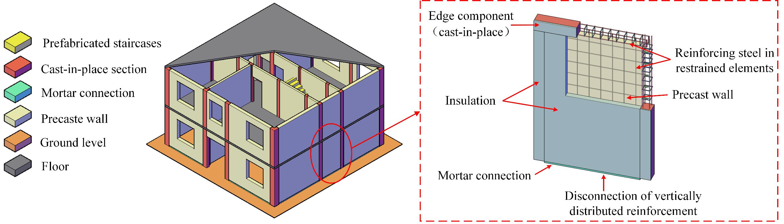 農村傳統(tǒng)自建房多為低層砌體結構,大多無專業(yè)設計、無專業(yè)施工,抗震性能通常較差,缺少節(jié)能保溫措施,且以現場施工建造為主,不僅工期長且勞動強度特別大。為此,本文提出了一種多功能一體化快裝低層建筑體系(圖1),由集承重和保溫功能于一體的鋼筋混凝土預制墻板裝配建造而成,可以實現村鎮(zhèn)建筑的抗震、節(jié)能、快速建造,綜合性能和效益十分顯著。