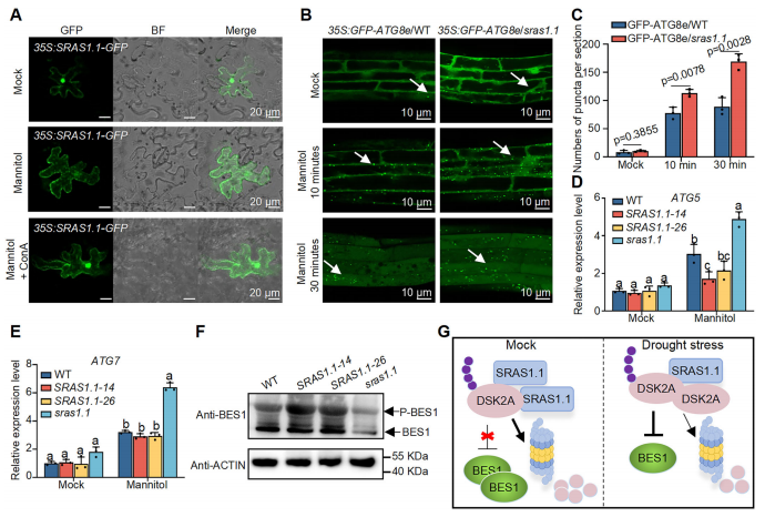 本研究研究通過遺傳學和分子生物學方法深入解析了SRAS1.1在干旱脅迫中的功能。研究者利用擬南芥的過表達株、突變體以及互補材料系統地比較了其干旱脅迫下的表型,結果發現,sras1.1突變體在干旱條件下表現出顯著增強的耐旱性。在干旱脅迫下SRAS1.1的亞細胞定位會發生改變:它從細胞核轉移至細胞質,形成自噬小體。進一步分子實驗解析表明,SRAS1.1與自噬受體DSK2A直接互作,促進其泛素化修飾并在26S蛋白酶體中降解。通過促進DSK2A降解,調節BES1在干旱脅迫下含量,調節自噬反應的平衡,進而調控干旱脅迫響應。