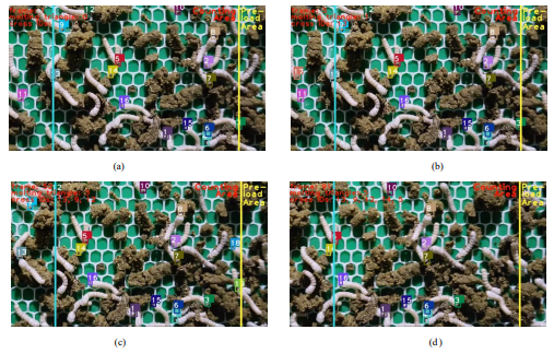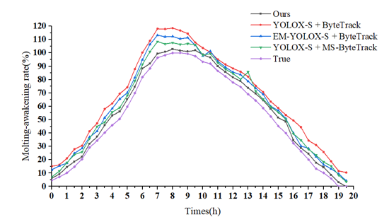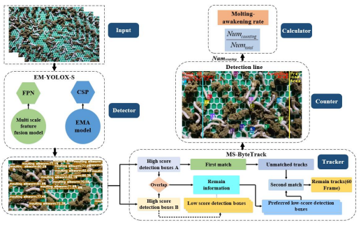 針對以上問題,團隊提出了一種基于眠三角跟蹤檢測的小蠶眠起狀態監測新方法。該方法基于優化的目標檢測器實現小蠶眠三角目標的檢測,在ByteTrack的基礎上提出了重合檢測框匹配法,解決了小蠶頭部交錯以及飼料遮擋導致檢測框頻繁切換的問題。同時,創新提出一種“檢測線 ”法來解決由于小蠶活動而導致的重復計數問題,最終實現了小蠶眠起率的準確獲取。使用該方法得到的眠起率趨勢也與真實趨勢保持高度一致。