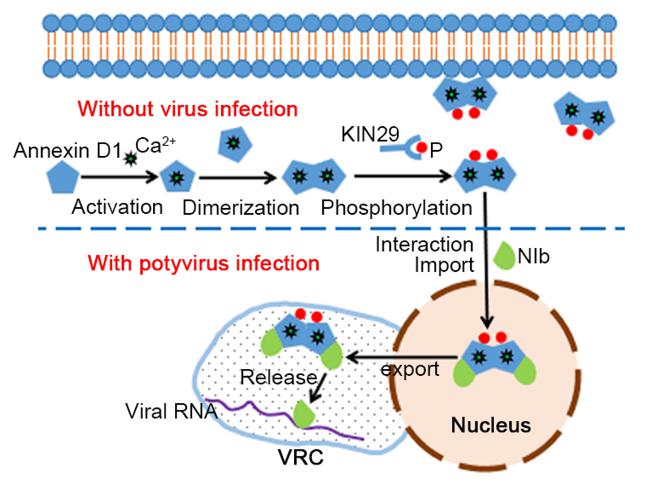 膜聯蛋白(Annexins)是一類具有鈣離子和磷脂結合能力的蛋白家族,在免疫調節中發揮重要作用。然而,膜聯蛋白是否調控植物病毒侵染尚未得到詳細研究。本研究發現,本氏煙膜聯蛋白D1(annexin D1 of N. benthamiana,NbANXD1)可形成二聚體,并通過結合煙草脈帶花葉病毒(tobacco vein banding mosaic virus,TVBMV)核內含體蛋白b(nuclear inclusion protein b,NIb)的C結構域與NIb互作。NIb能夠將NbANXD1招募至核周區域,NIb-NbANXD1互作復合體與TVBMV的6K2蛋白共定位。進一步分析表明,本氏煙蛋白激酶29(phosphokinase 29 of N. benthamiana,NbKIN29)可與NbANXD1相互作用,并特異性地在NbANXD1的T204、T276和S286位點進行磷酸化。此外,鈣離子(Ca2?)通過調控NbKIN29對NbANXD1的磷酸化作用參與TVBMV侵染。基因沉默、過表達、基因敲除及突變實驗結果表明,膜聯蛋白D1正調控馬鈴薯Y病毒屬病毒的復制和系統侵染。總之,本研究揭示了馬鈴薯Y病毒屬病毒NIb通過挾持膜聯蛋白D1并利用蛋白激酶KIN29介導的依賴鈣離子的磷酸化完成病毒自身侵染,為培育抗馬鈴薯Y病毒屬病毒的植株提供了新的靶標。