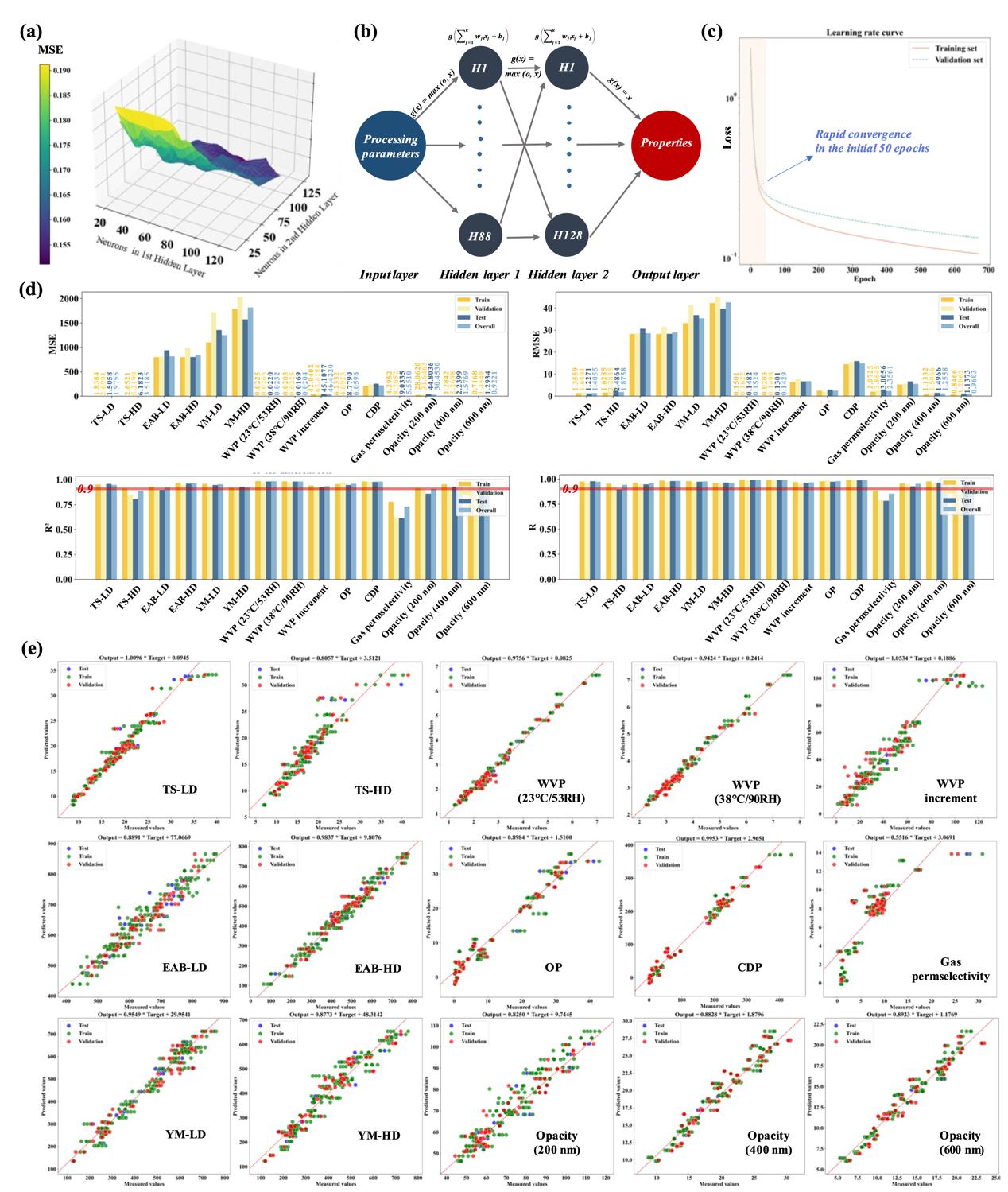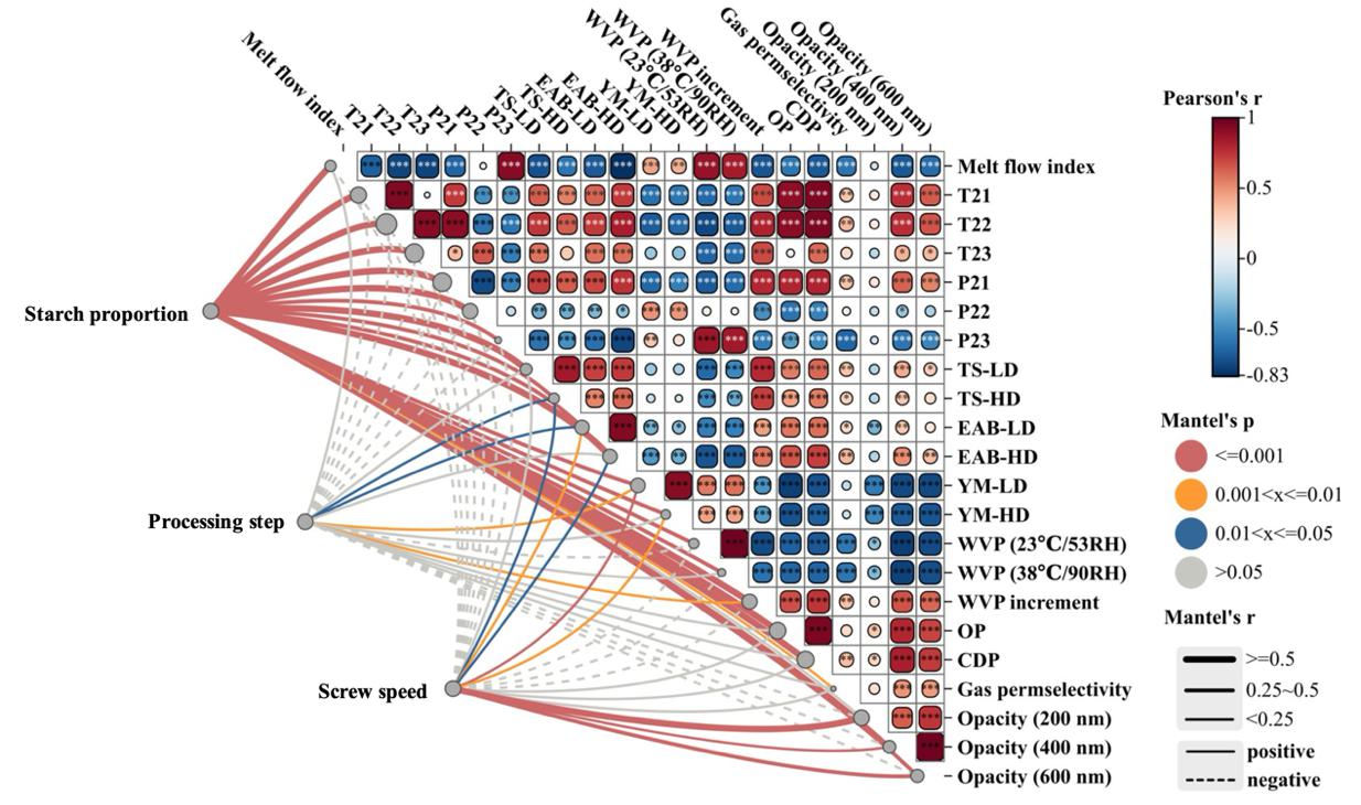為此,本研究構建了一個僅包含淀粉、甘油與PBAT的簡化體系,以系統研究淀粉/PBAT復合材料在擠出成膜過程中的結構演變。在此基礎上,通過擠出吹塑工藝共制備了60種不同配方的淀粉/PBAT薄膜,建立了包含18個變量的數據庫,涵蓋淀粉比例、加工步驟、螺桿轉速、機械及阻隔性能等指標。結果表明,成膜過程中淀粉發生了鍵斷裂、雙螺旋結構崩解與分子量降低;而在吹膜階段,淀粉與PBAT相內的分子重排及結晶狀態變化導致體系出現相分離現象。通過三因素方差分析、兩步聚類分析以及Pearson與Mantel相關性分析,揭示了成膜參數與薄膜理化性能之間的內在聯系。在此基礎上,構建了基于加工參數的人工神經網絡模型,實現了對薄膜機械與阻隔性能的精準預測,模型表現出較高的擬合度(R> 0.9)與良好的泛化能力。本研究有助于深入理解加工條件對淀粉/PBAT薄膜結構與性能的影響機制,并為其工業化制備與性能優化提供了重要的理論與數據支撐。