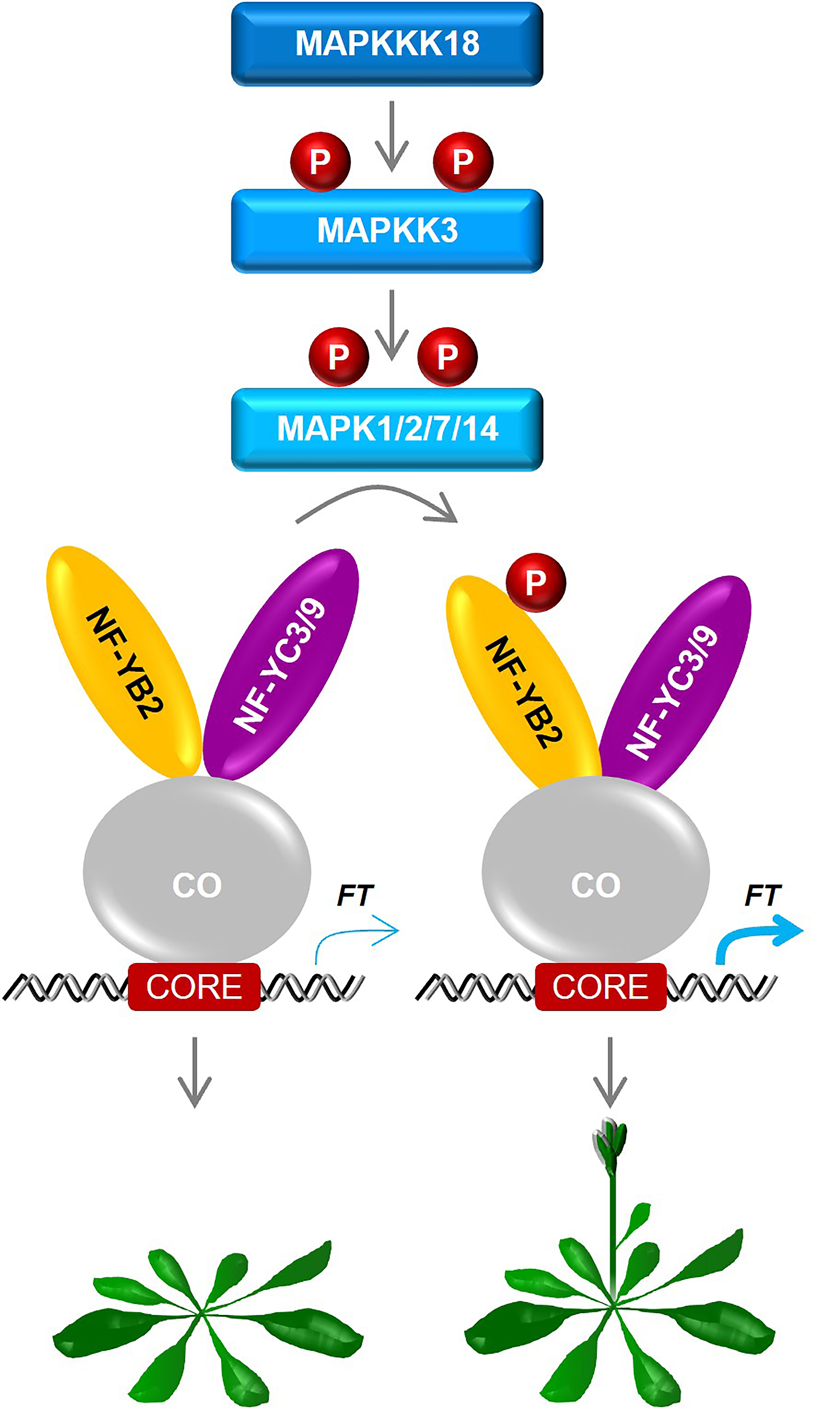進一步的研究表明,磷酸化修飾對NF-YB2的亞細胞定位及蛋白穩(wěn)定性均沒有影響,但磷酸化形式的NF-YB2與NF-YC3/9及CO (CONSTANS)間的互作增強,且形成異源三聚體后,CO識別結(jié)合FT(flowering locus T)啟動子中CORE元件的能力顯著提高,F(xiàn)T的表達水平上升,進而導致早花(圖3)。