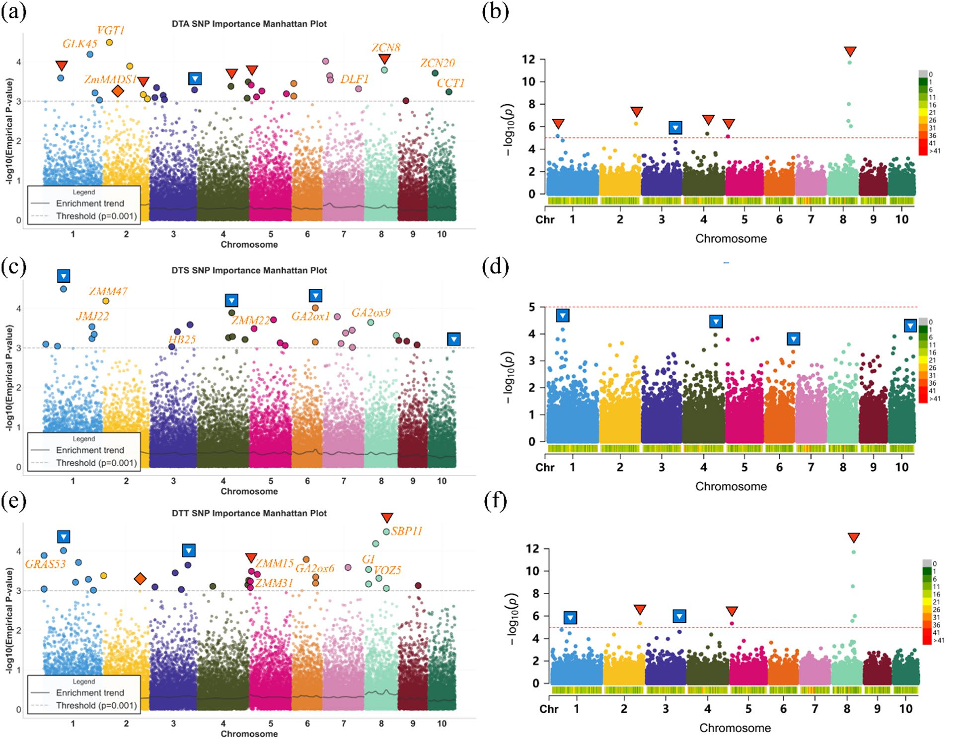 現有全基因組選擇(genomic selection,GS)方法多以加性模型為主,上位性等非加性效應的建模能力相對不足,對復雜數量性狀的遺傳貢獻刻畫不夠充分。深度模型雖然具備更強的非線性表達能力,但在多特征小樣本條件下訓練與泛化容易受限,難以支撐育種決策與生物學驗證。團隊創新性的提出一種金字塔式可解釋育種工具(DNAwhisper模型,圖1):該工具可將分子標記按遺傳分塊進行分層處理,借助模塊參數共享機制降低模型規模;融合關系保持預訓練,以自監督方式對齊樣本間遺傳距離,使模型在隱空間中保留群體親緣結構,從而在小樣本條件下獲得更穩健的歸納偏置。借助深度監督技術,將性狀相關的遺傳關聯信號逐層蒸餾,既強化預測所需的關鍵信息,也為后續機制解析提供可追溯的表征基礎以提升可解釋性。研究表明,DNAwhisper模型在多個農作物群體上相較基準模型預測精度提升3.0%至10.0%,并可通過注意力權重回溯識別赤霉素(GA)代謝通路等關鍵調控信號(圖2)。該方法為作物復雜表型的早期預測和數量性狀遺傳位點的深度挖掘提供了新的途徑,可用于輔助種質篩選從而加速育種進程。