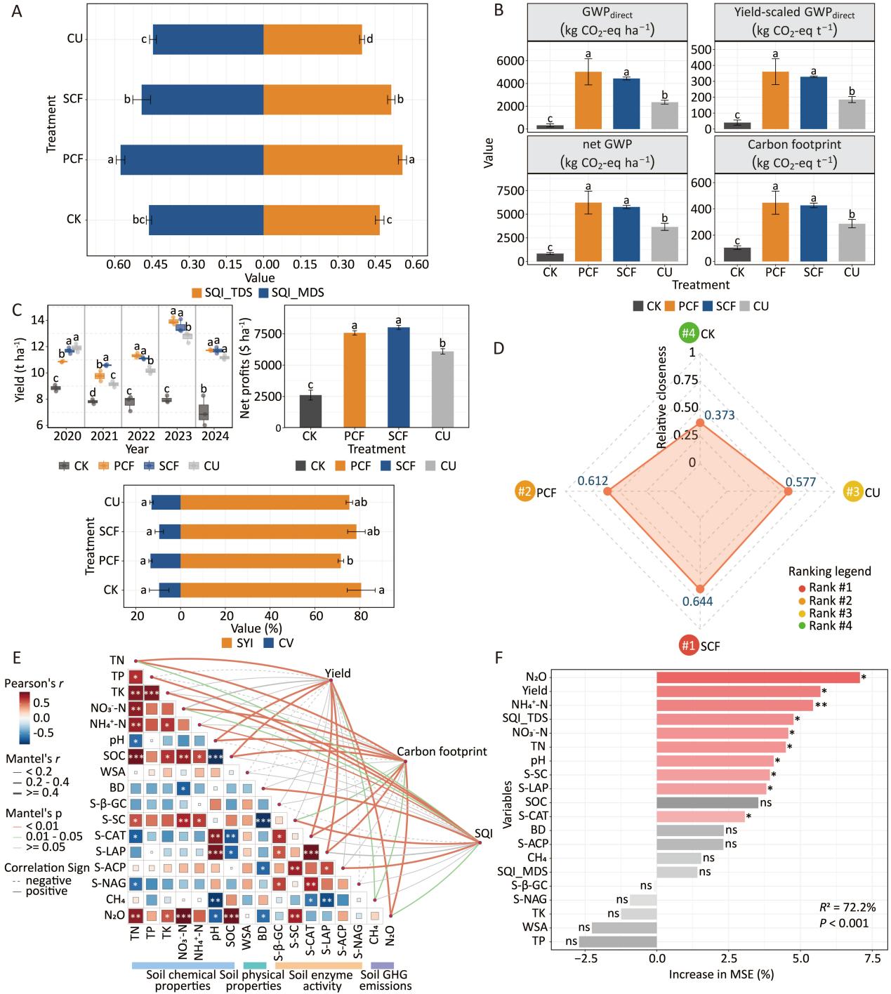 在產(chǎn)量與經(jīng)濟(jì)效益方面,PCF和SCF處理的產(chǎn)量分別較CU提高4.5%和6.3%,累計(jì)凈收益分別高出24.3%和31.5%,展現(xiàn)出顯著的增產(chǎn)增收優(yōu)勢。然而在產(chǎn)量穩(wěn)定性方面,SCF處理的可持續(xù)產(chǎn)量指數(shù)(SYI)優(yōu)于PCF。在土壤質(zhì)量方面,PCF處理表現(xiàn)最為突出,其SQI較SCF和CU處理分別提升8.7%和41.1%。與CU處理相比,PCF處理顯著提高了蔗糖酶(S-SC)、亮氨酸氨基肽酶(S-LAP)、酸性磷酸酶(S-ACP)等多種土壤酶活性,同時(shí)顯著增加了土壤養(yǎng)分含量并降低了土壤容重,有助于長期維持與提升土壤肥力。在碳足跡方面,PCF和SCF處理的累積N2O排放量分別比CU處理高出114.3%和88.9%,從而增加了直接全球變暖潛勢(GWPdirect)和碳足跡。TOPSIS多準(zhǔn)則分析將各處理綜合排名為SCF > PCF > CU > CK,SCF處理綜合表現(xiàn)最優(yōu)。上述結(jié)果表明,硫包衣尿素是黃淮海平原集約化玉米生產(chǎn)中兼顧產(chǎn)量效益與環(huán)境可持續(xù)性的優(yōu)選策略。未來研究應(yīng)進(jìn)一步將控釋肥管理與其他可持續(xù)農(nóng)業(yè)措施協(xié)同整合,針對(duì)不同氣候和土壤條件開發(fā)更精準(zhǔn)的施肥方案,以實(shí)現(xiàn)增產(chǎn)、固碳與減排的多目標(biāo)協(xié)同優(yōu)化。