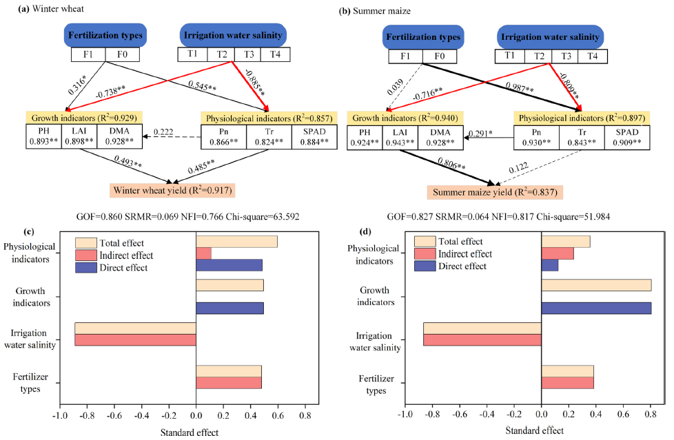 華北平原淡水資源短缺,安全高效利用咸水灌溉是維持農(nóng)業(yè)生產(chǎn)可持續(xù)發(fā)展的重要途徑之一。然而,長(zhǎng)期咸水灌溉對(duì)土壤環(huán)境和作物生長(zhǎng)具有潛在危害。本研究基于長(zhǎng)期定位試驗(yàn),探究了咸水灌溉配施有機(jī)肥對(duì)冬小麥-夏玉米生長(zhǎng)發(fā)育和產(chǎn)量形成的調(diào)控效應(yīng)。研究發(fā)現(xiàn),適量濃度的微咸水灌溉對(duì)冬小麥和夏玉米生長(zhǎng)發(fā)育和籽粒產(chǎn)量無(wú)顯著影響,但超過(guò)一定閾值會(huì)顯著降低作物產(chǎn)量;與冬小麥相比,咸水灌溉對(duì)夏玉米的抑制作用更為明顯。增施有機(jī)肥可有效緩解咸水灌溉對(duì)麥玉生長(zhǎng)性狀和光合性能的不利影響,并通過(guò)不同機(jī)制提高籽粒產(chǎn)量。有機(jī)肥通過(guò)對(duì)冬小麥生長(zhǎng)和生理指標(biāo)的雙重調(diào)節(jié)來(lái)提高產(chǎn)量,對(duì)耐鹽性較弱的夏玉米,則通過(guò)提高光合性能調(diào)節(jié)生長(zhǎng)來(lái)提高產(chǎn)量。